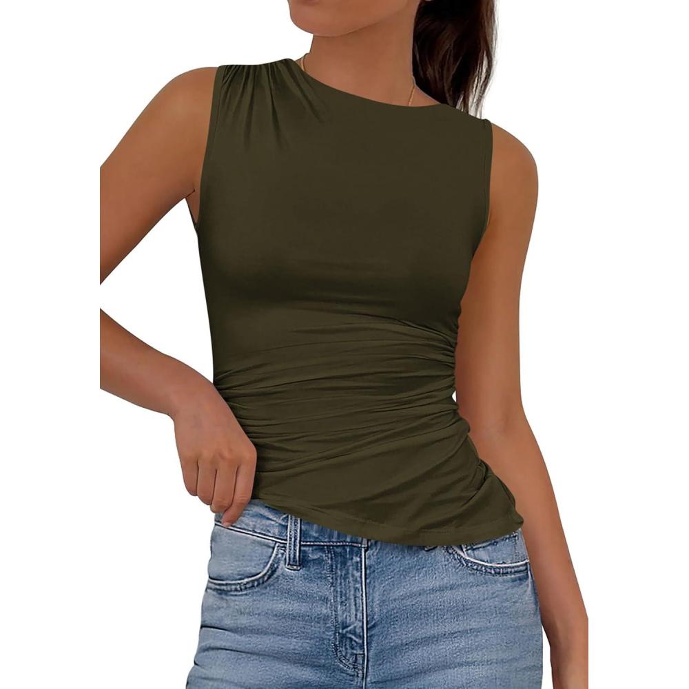 PRETTYGARDEN Womens Tank Top Spring 2026 Ruched Asymmetrical Going Out Top Slim Fit Sleeveless Shirts Summer Clothes(Army Green)