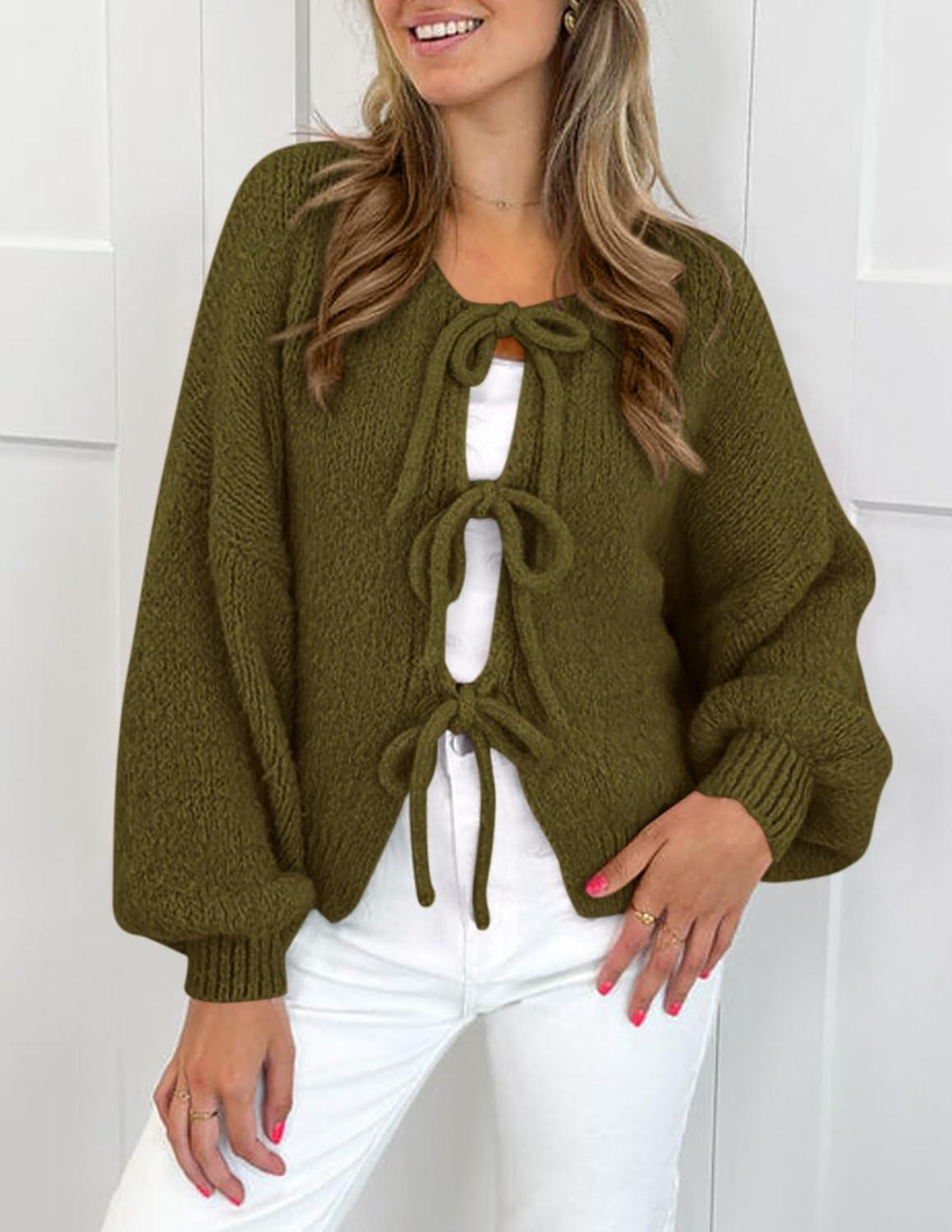 PRETTYGARDEN Women's Tie Front Bow Cardigan Sweaters Chunky Knit Long Puff Sleeve Trendy Fall Winter Jacket Coats(Army Green)