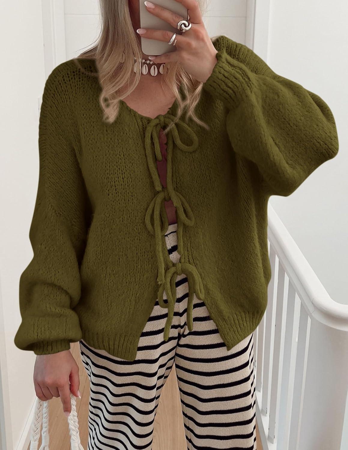 PRETTYGARDEN Women’s Tie Front Bow Cardigan Sweaters Chunky Knit Long Puff Sleeve Trendy Fall Winter Jacket Coats(Army Green)