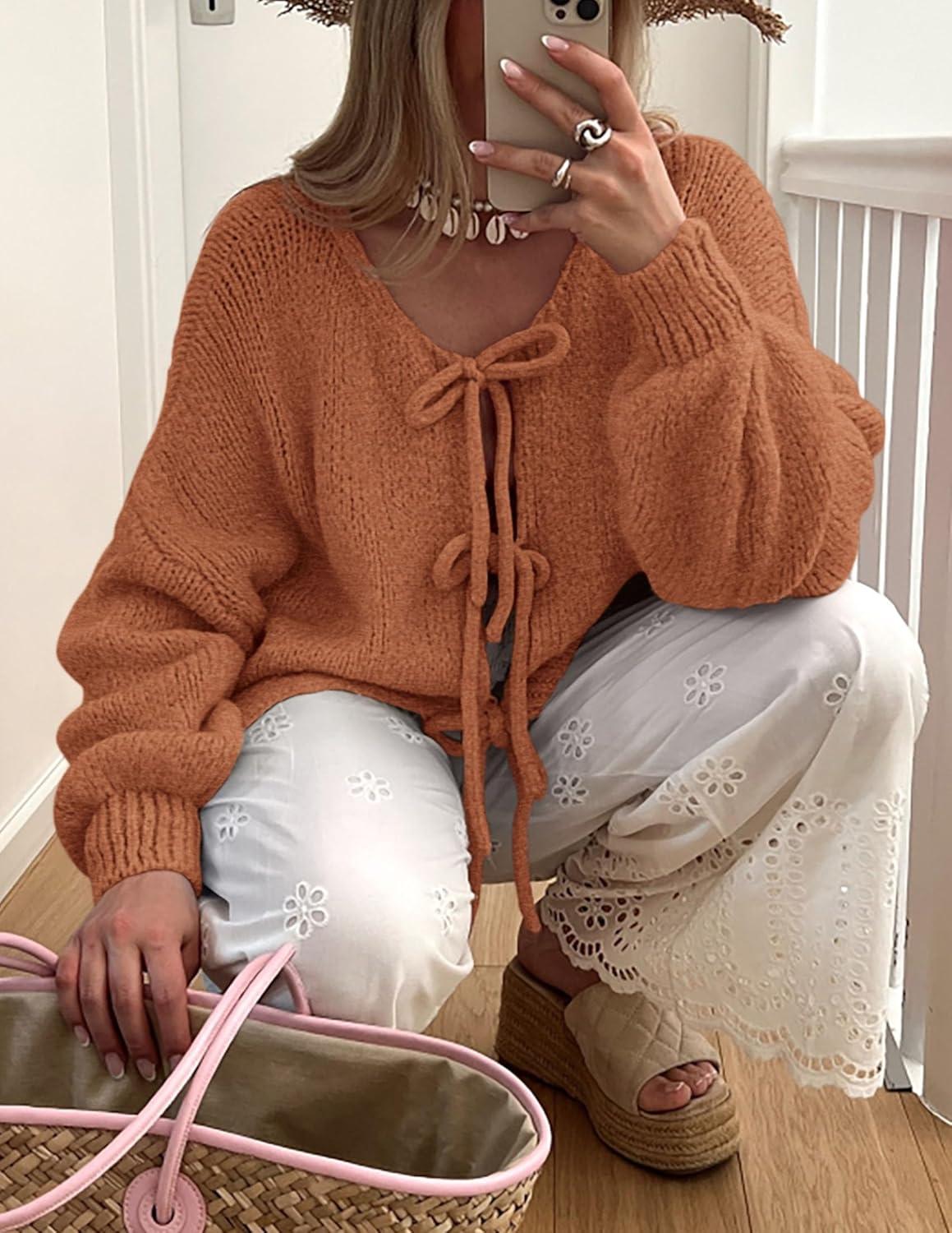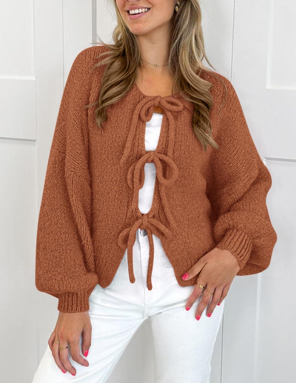 PRETTYGARDEN Women's Tie Front Bow Cardigan Sweaters Chunky Knit Long Puff Sleeve Trendy Fall Winter Jacket Coats(Brick Red)