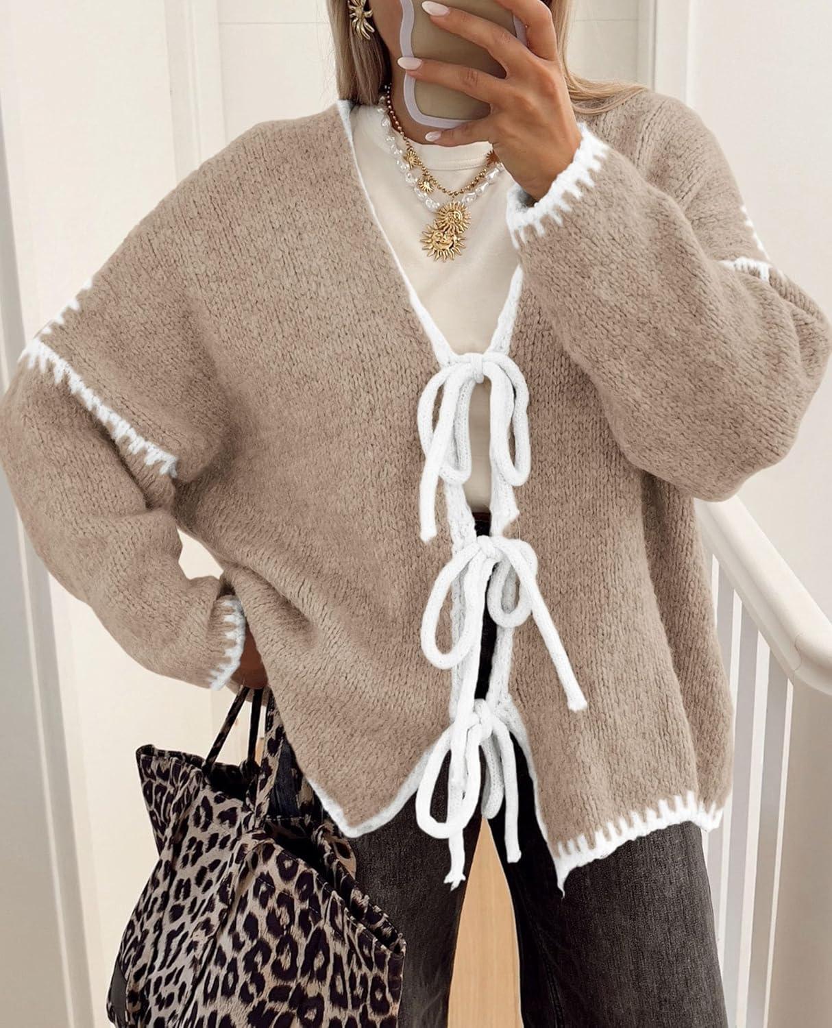 PRETTYGARDEN Women’s Tie Front Bow Cardigan Sweaters Chunky Knit Long Puff Sleeve Trendy Fall Winter Jacket Coats(Camel White)