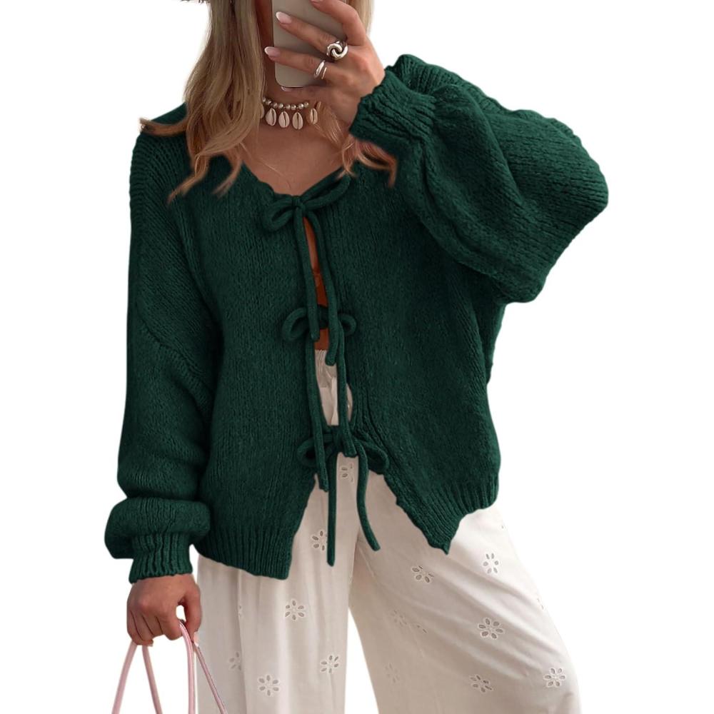 PRETTYGARDEN Women's Tie Front Bow Cardigan Sweaters Chunky Knit Long Puff Sleeve Trendy Fall Winter Jacket Coats(Dark Green)