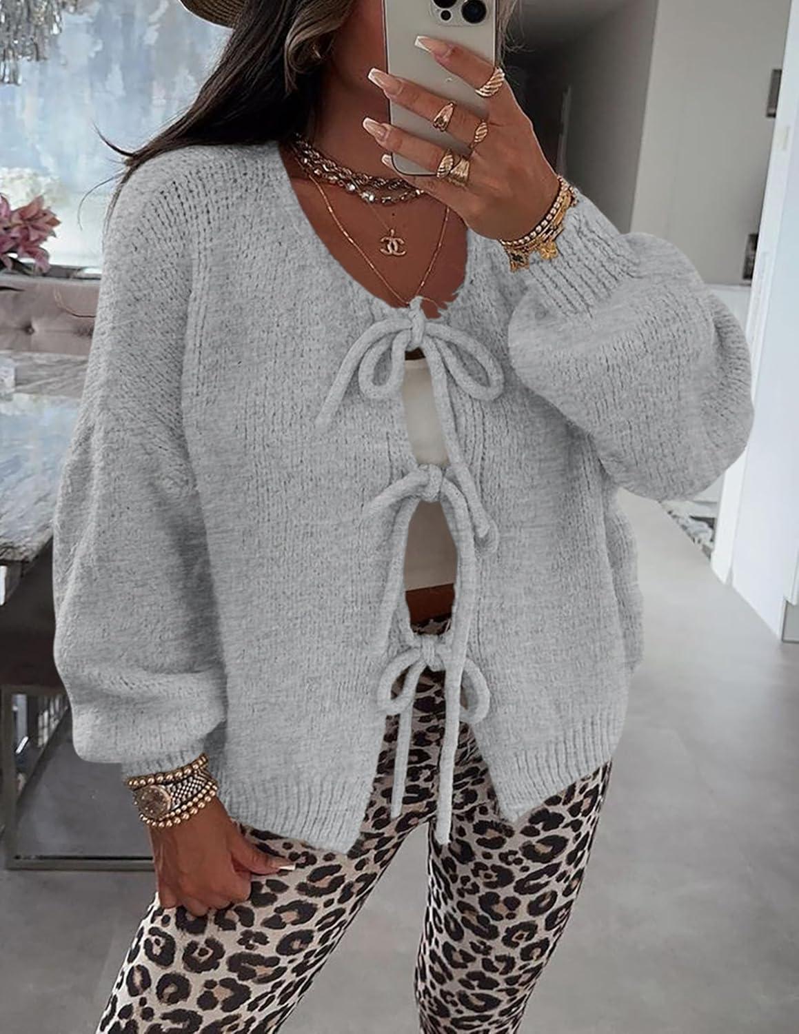 PRETTYGARDEN Women's Tie Front Bow Cardigan Sweaters Chunky Knit Long Puff Sleeve Trendy Fall Winter Jacket Coats(Light Grey)