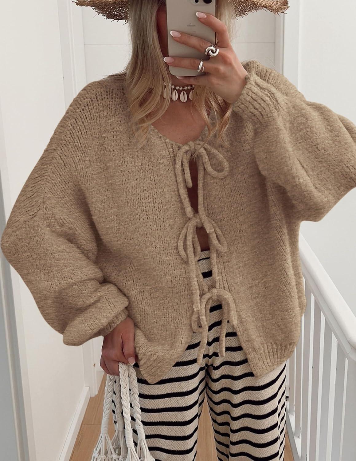 PRETTYGARDEN Women’s Tie Front Bow Cardigan Sweaters Chunky Knit Long Puff Sleeve Trendy Fall Winter Jacket Coats(Light Khaki)