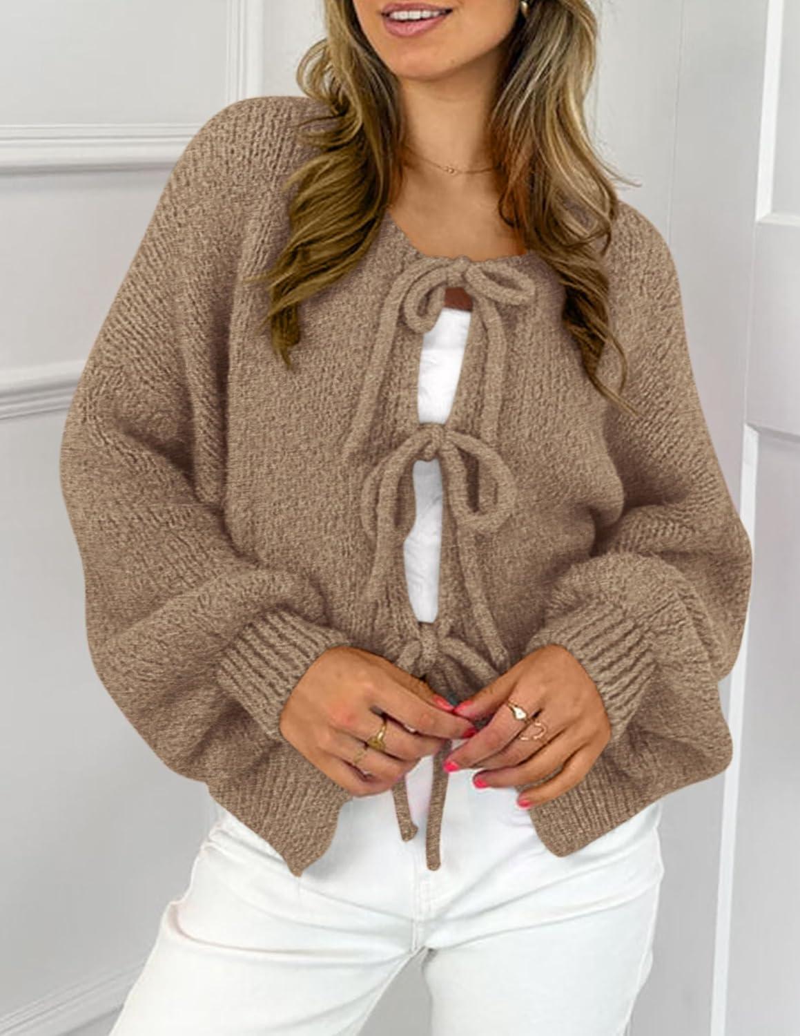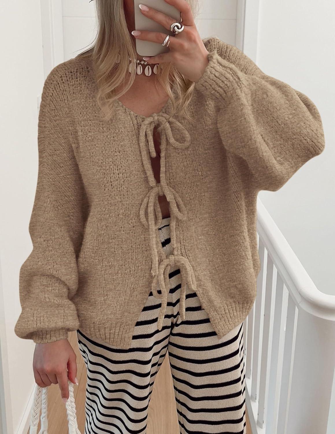 PRETTYGARDEN Women's Tie Front Bow Cardigan Sweaters Chunky Knit Long Puff Sleeve Trendy Fall Winter Jacket Coats(Light Khaki)