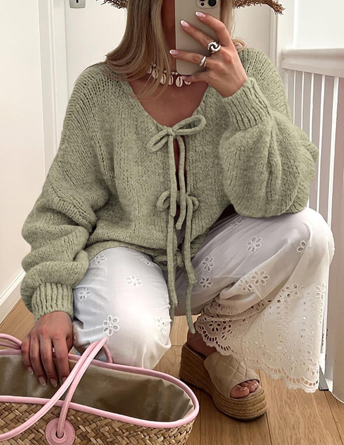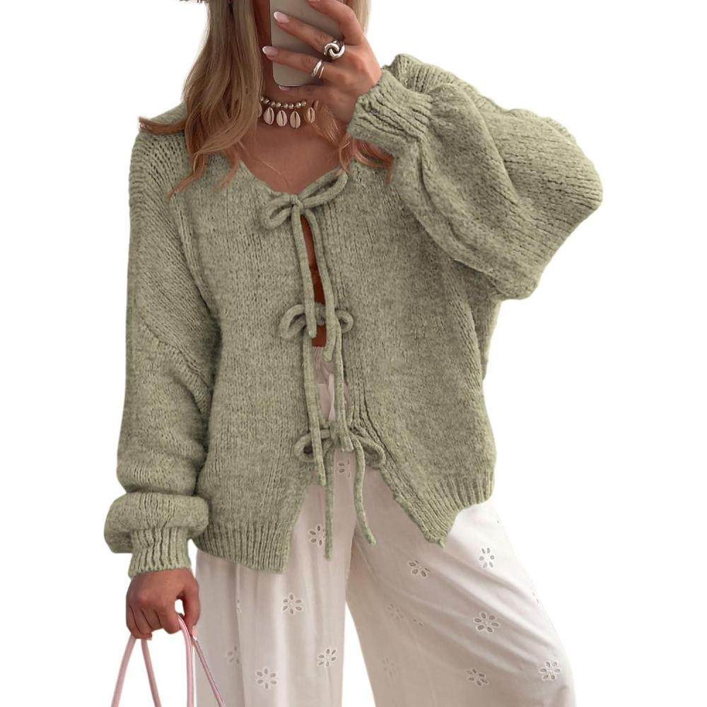 PRETTYGARDEN Women’s Tie Front Bow Cardigan Sweaters Chunky Knit Long Puff Sleeve Trendy Fall Winter Jacket Coats(Mist Green)