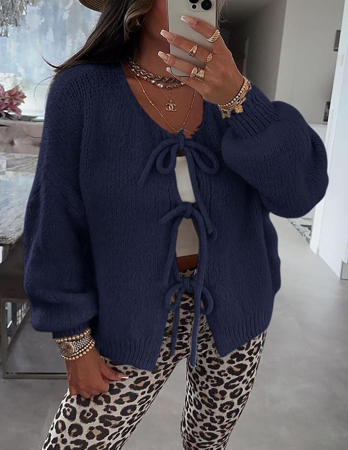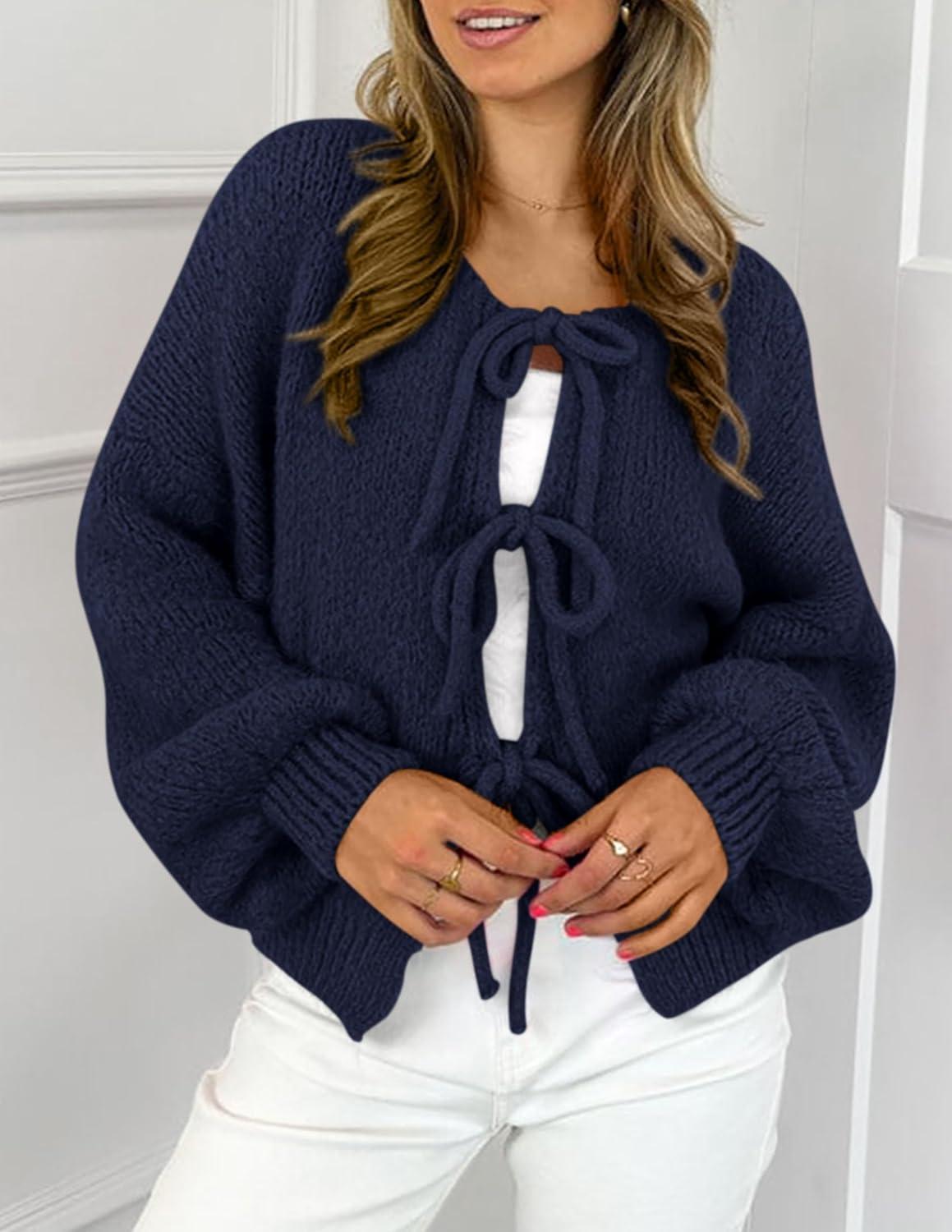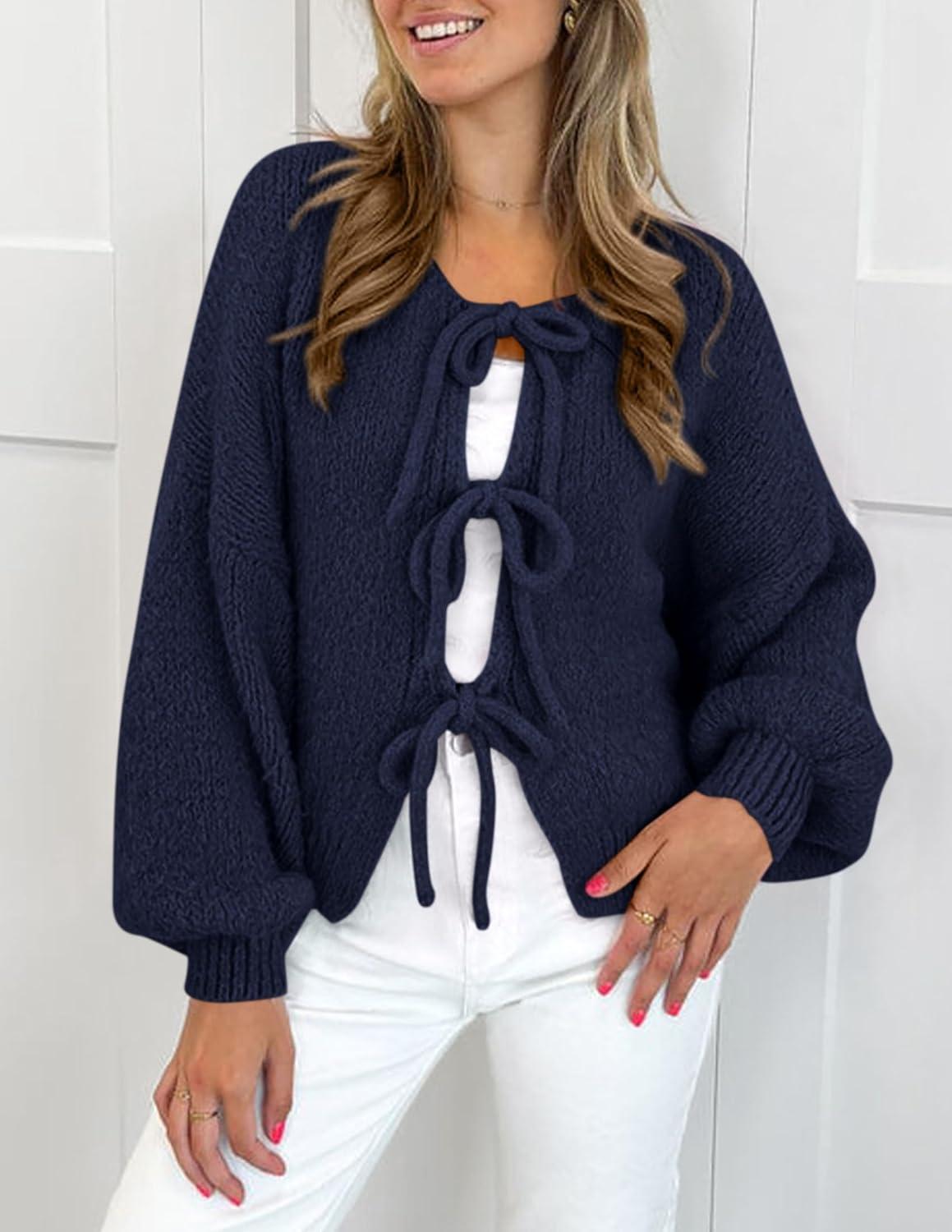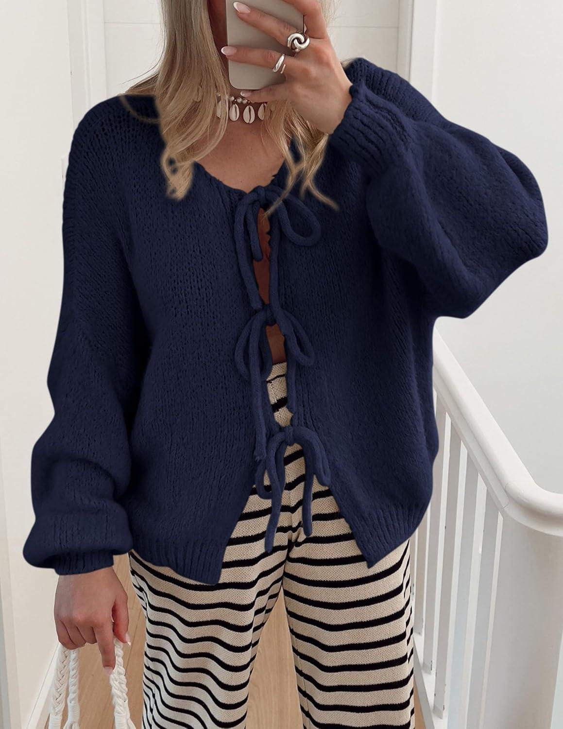 PRETTYGARDEN Women's Tie Front Bow Cardigan Sweaters Chunky Knit Long Puff Sleeve Trendy Fall Winter Jacket Coats(Navy)