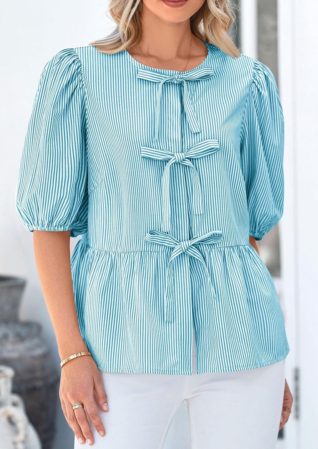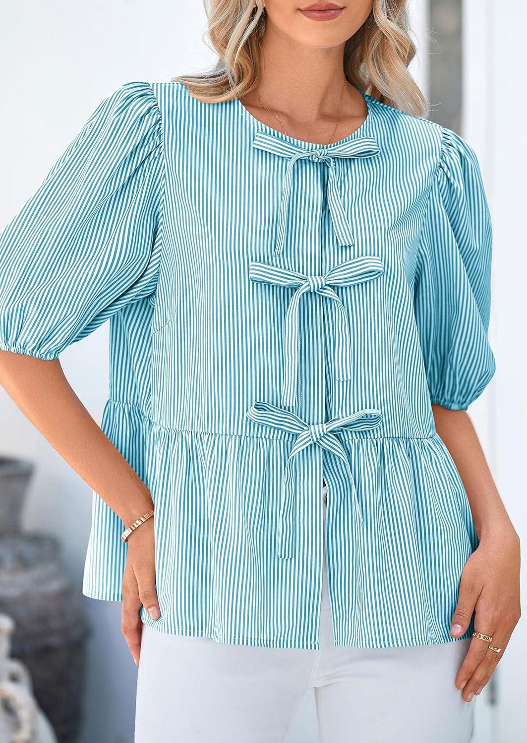PRETTYGARDEN Women's Tie Front Striped Shirt 2025 Summer Trendy Fashion Cute Babydoll Tops Peplum Puffy Sleeve Blouse(Blue Green)