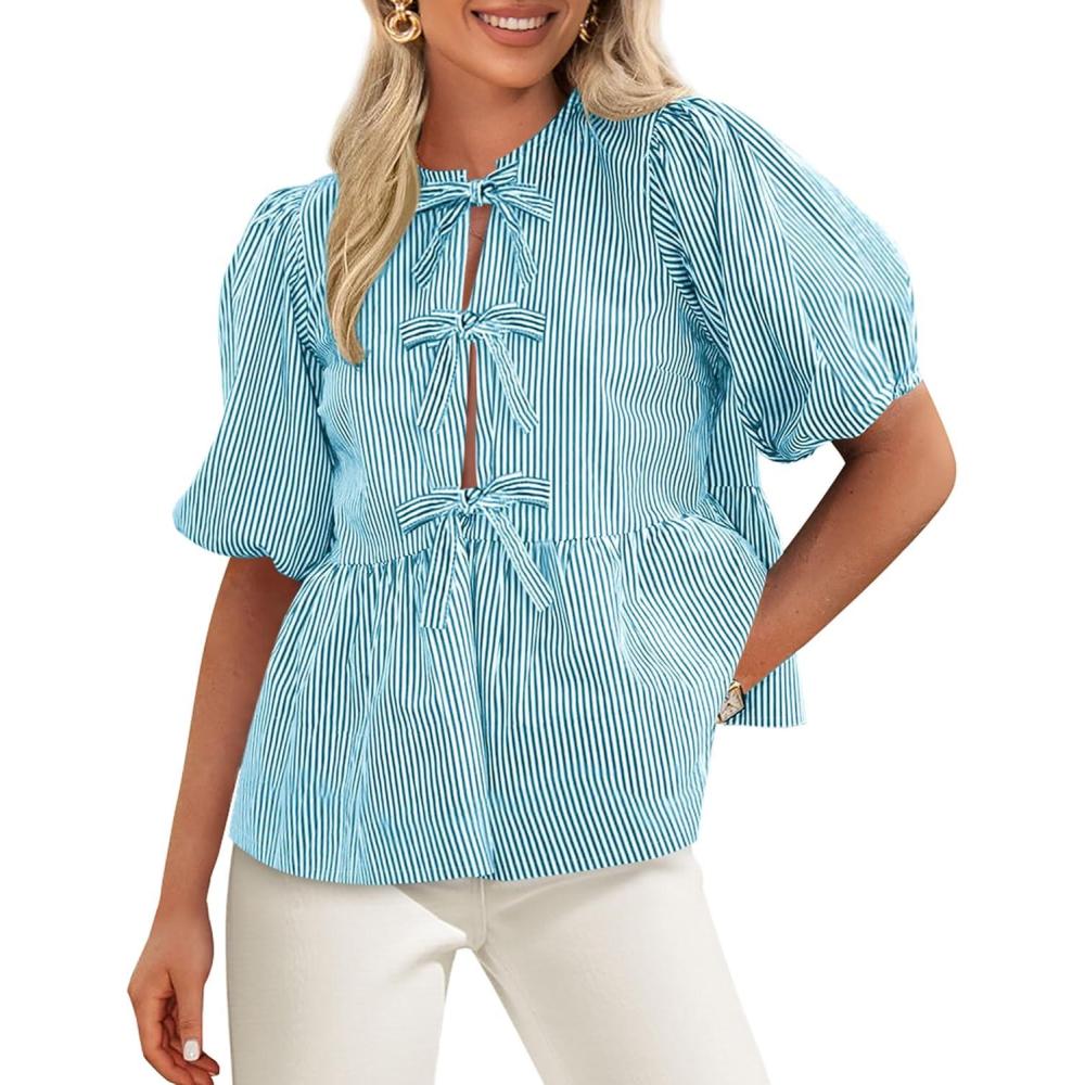 PRETTYGARDEN Women’s Tie Front Striped Shirt 2025 Summer Trendy Fashion Cute Babydoll Tops Peplum Puffy Sleeve Blouse(Blue)