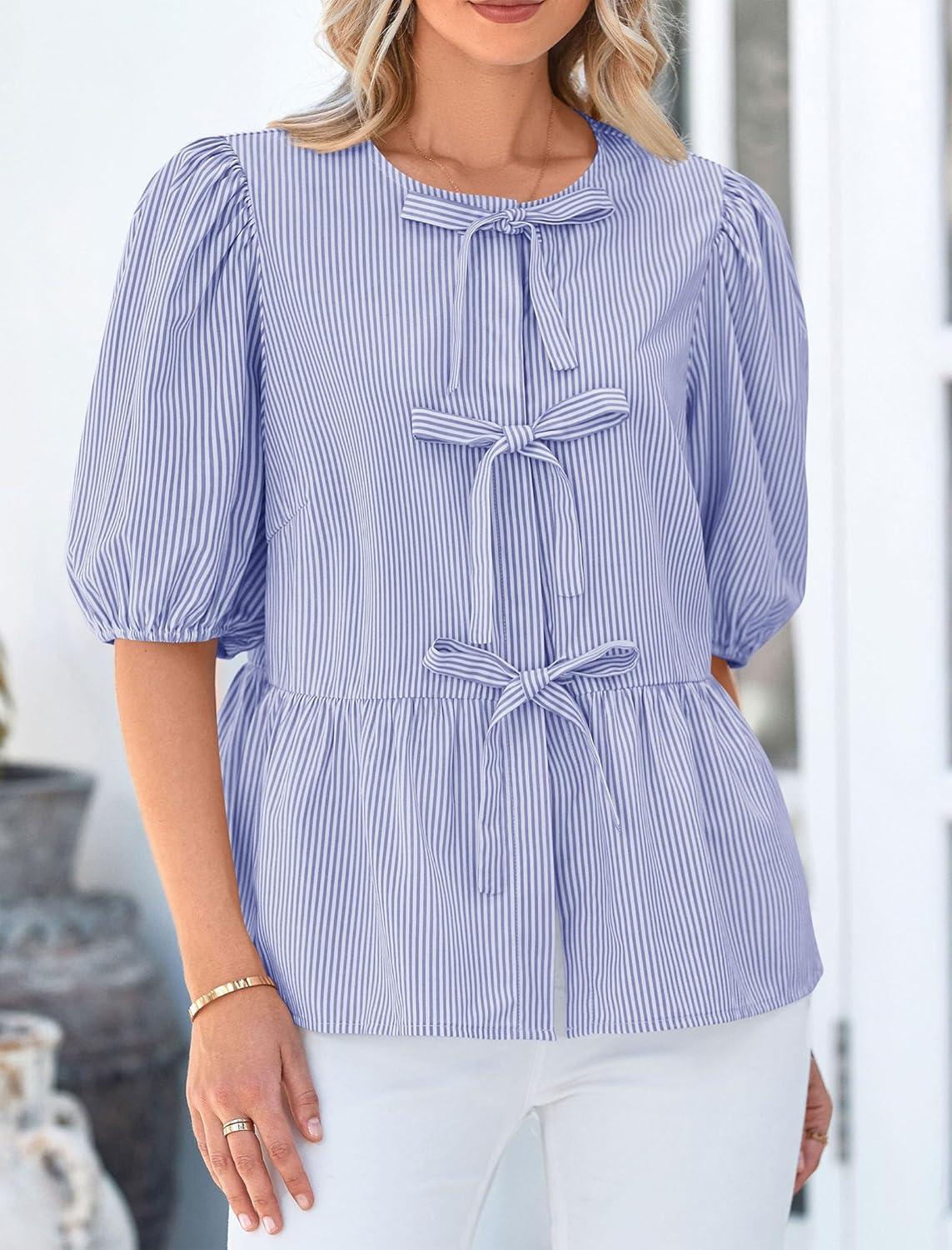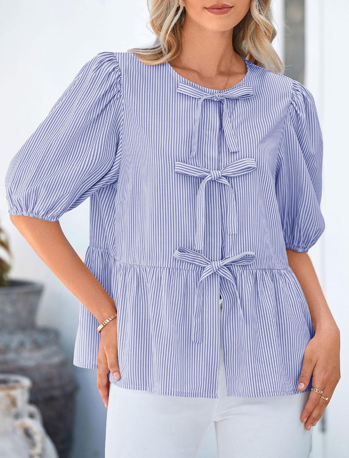 PRETTYGARDEN Women’s Tie Front Striped Shirt 2025 Summer Trendy Fashion Cute Babydoll Tops Peplum Puffy Sleeve Blouse(Blue)