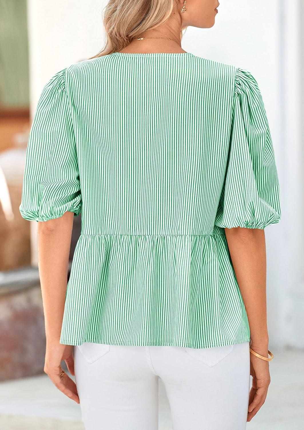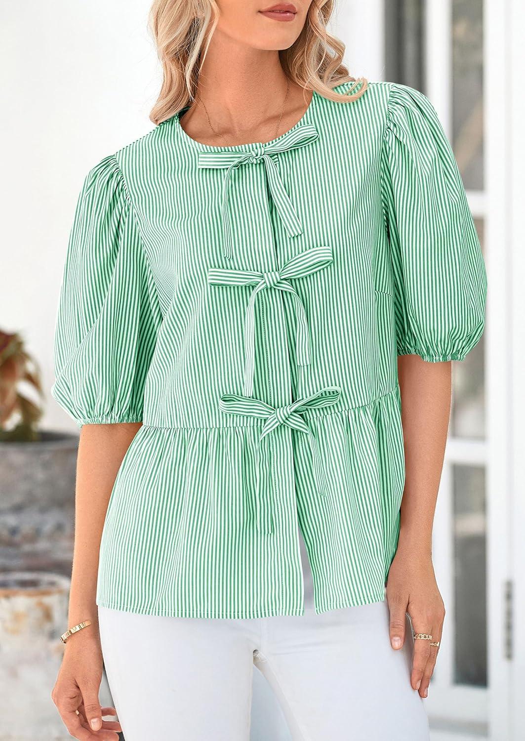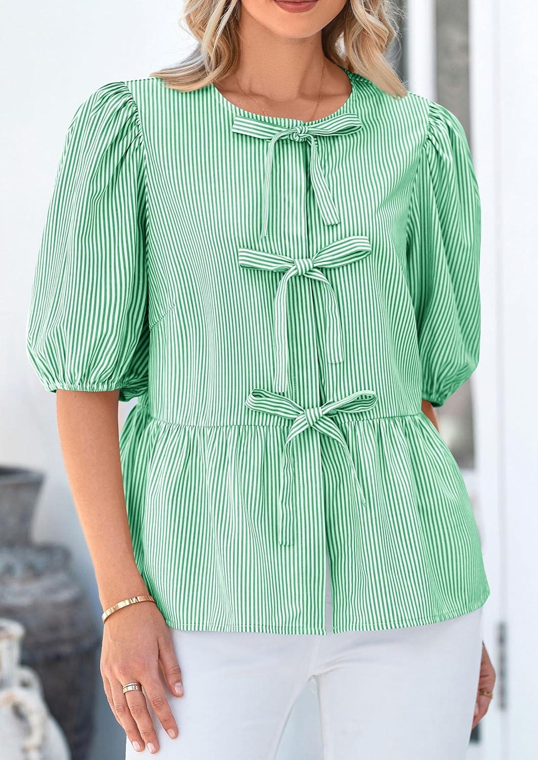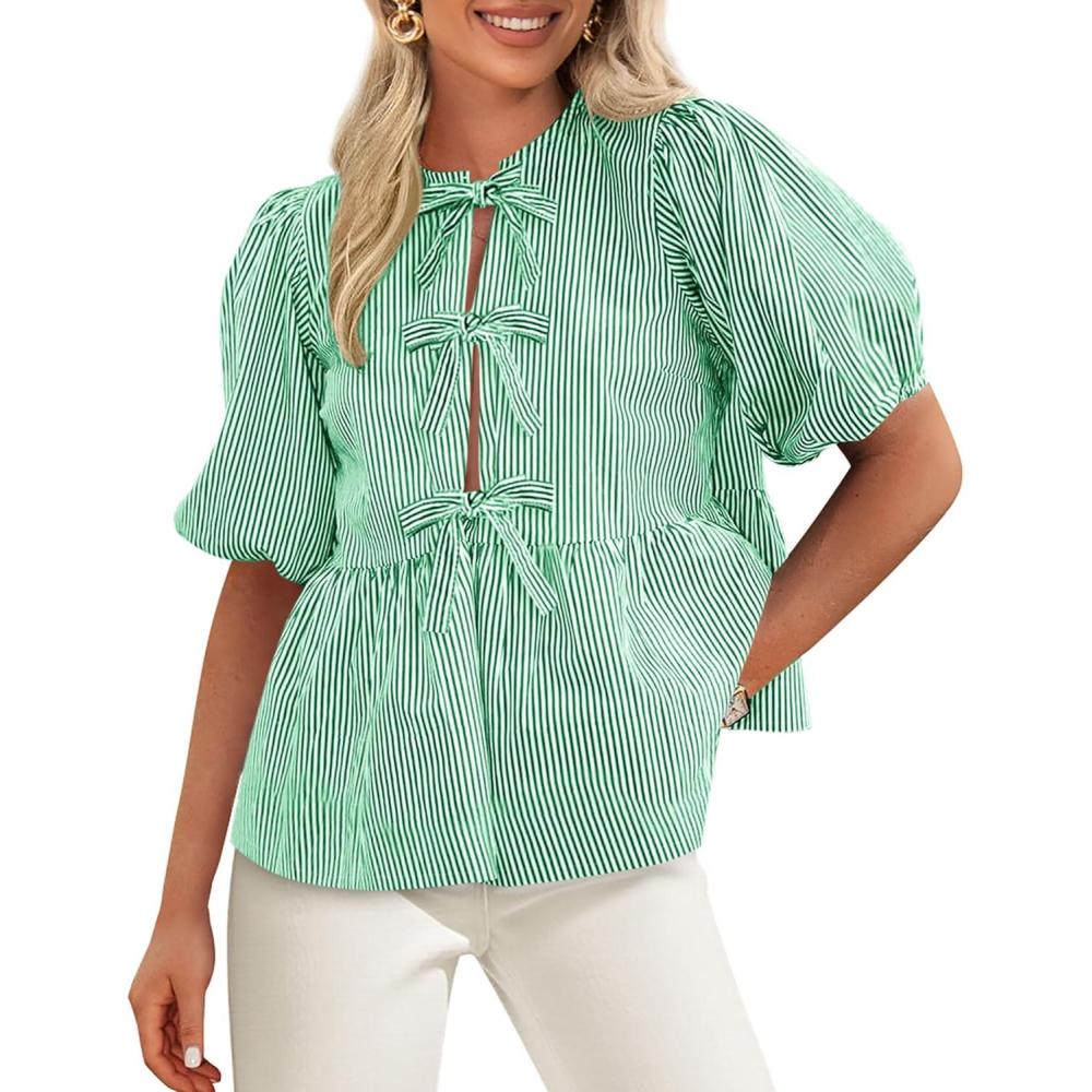 PRETTYGARDEN Women’s Tie Front Striped Shirt 2025 Summer Trendy Fashion Cute Babydoll Tops Peplum Puffy Sleeve Blouse(Green)