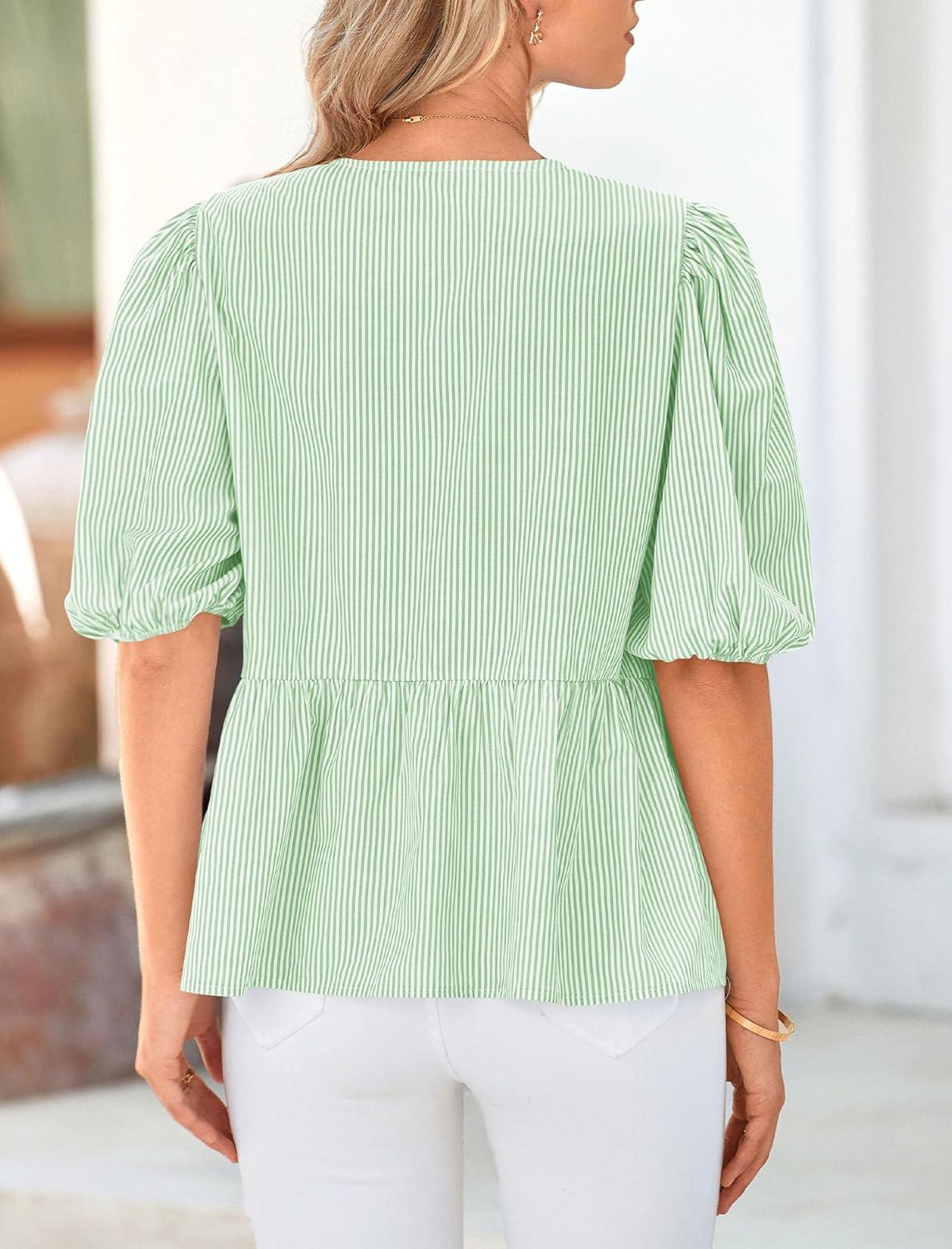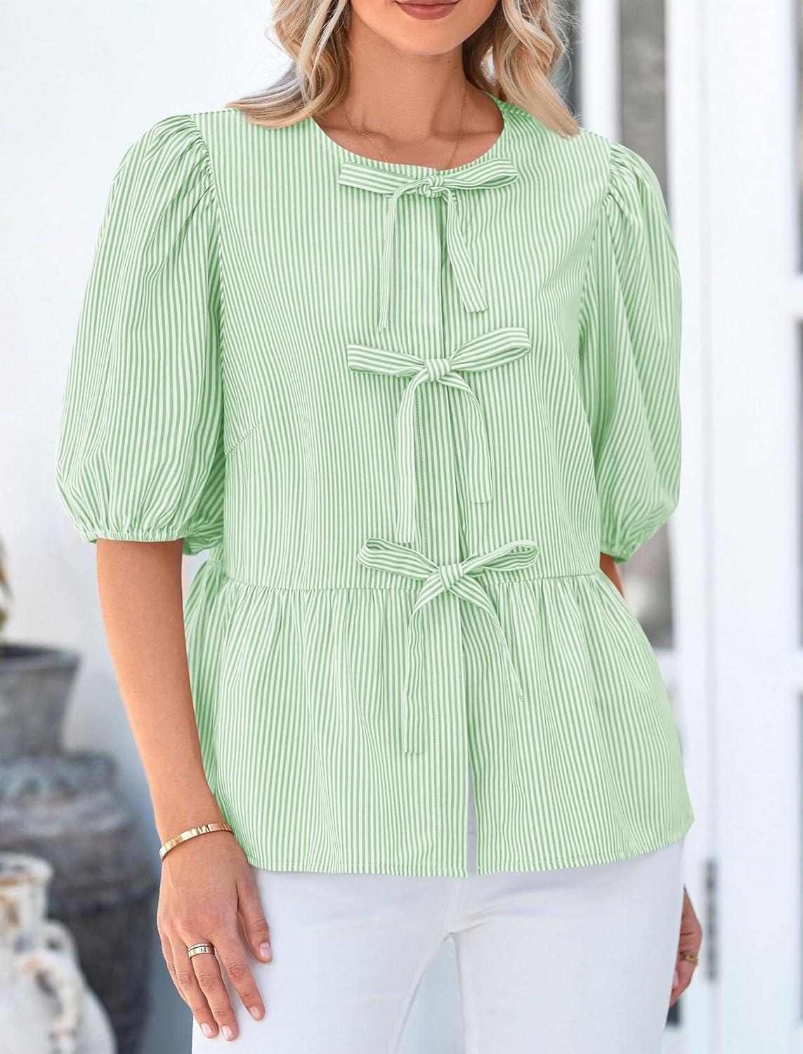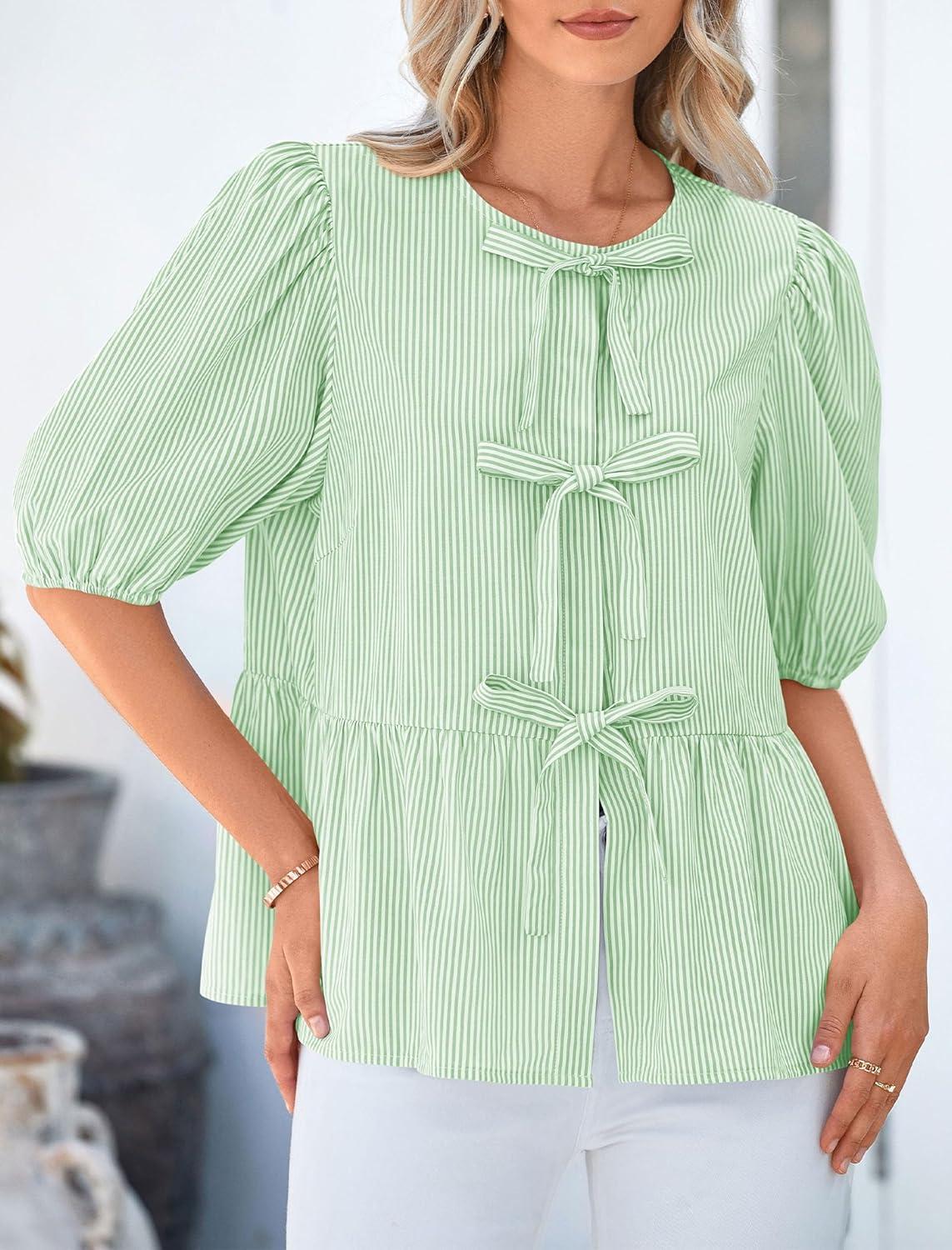 PRETTYGARDEN Women’s Tie Front Striped Shirt 2025 Summer Trendy Fashion Cute Babydoll Tops Peplum Puffy Sleeve Blouse(Light Green)