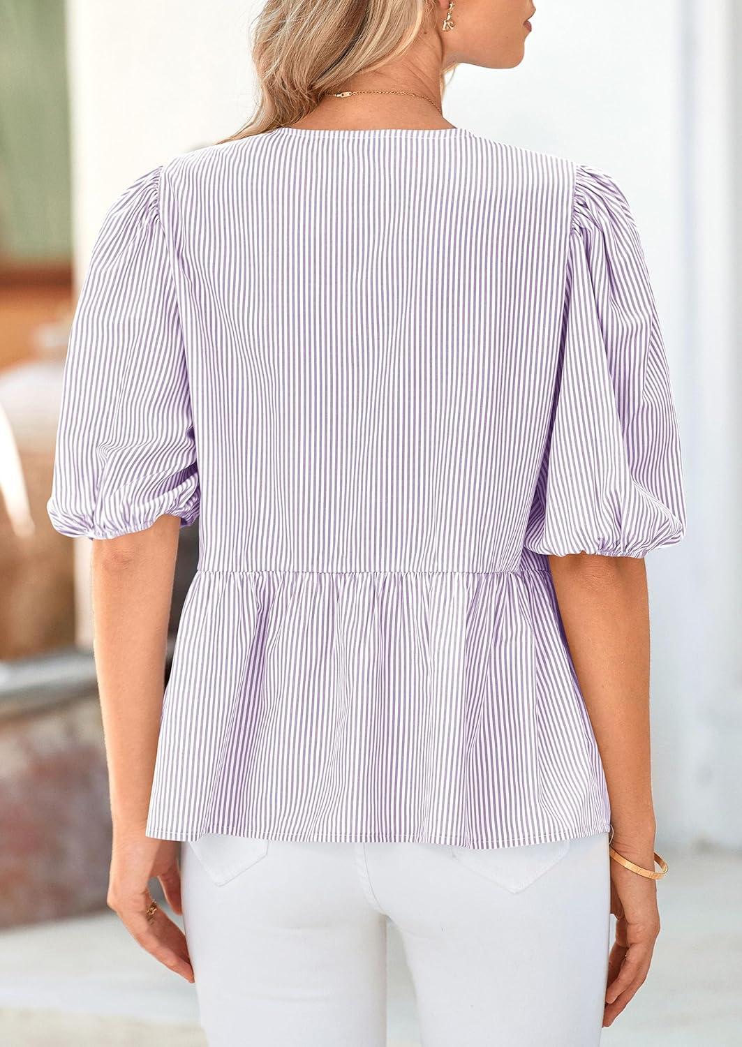 Be the first to review “PRETTYGARDEN Women’s Tie Front Striped Shirt 2025 Summer Trendy Fashion Cute Babydoll Tops Peplum Puffy Sleeve Blouse(Light Purple)”