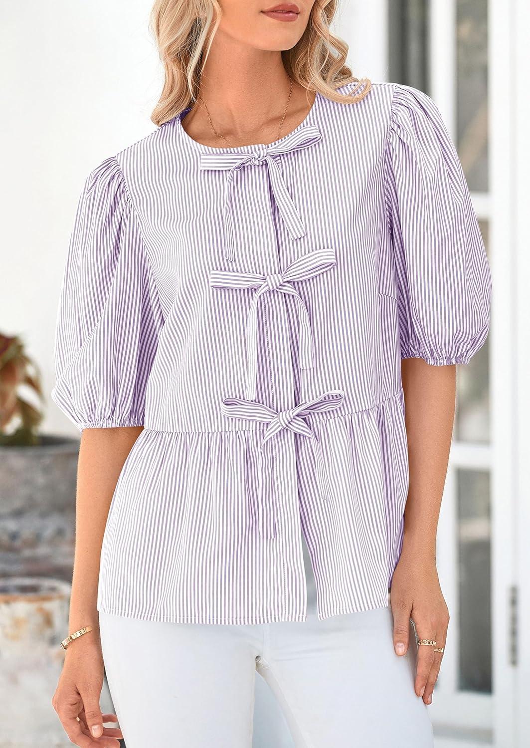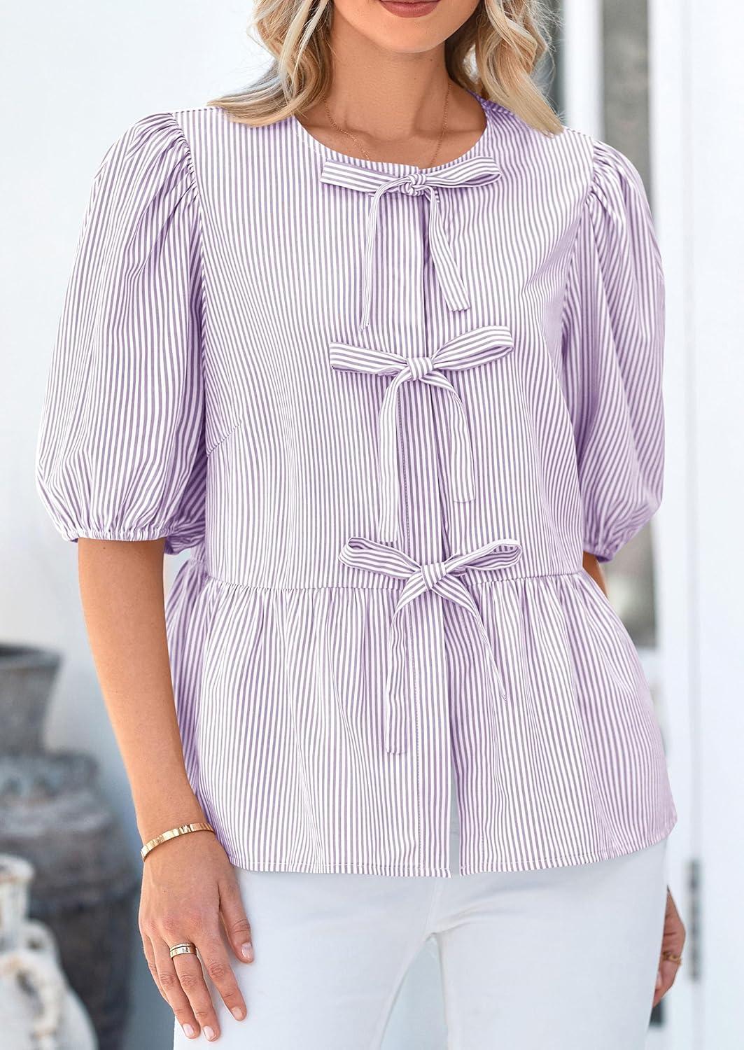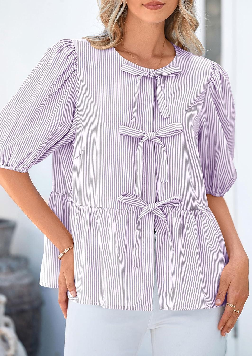 PRETTYGARDEN Women’s Tie Front Striped Shirt 2025 Summer Trendy Fashion Cute Babydoll Tops Peplum Puffy Sleeve Blouse(Light Purple)