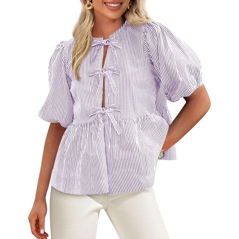 imagePRETTYGARDEN Womens Tie Front Striped Shirt 2025 Summer Trendy Fashion Cute Babydoll Tops Peplum Puffy Sleeve BlouseLight Purple