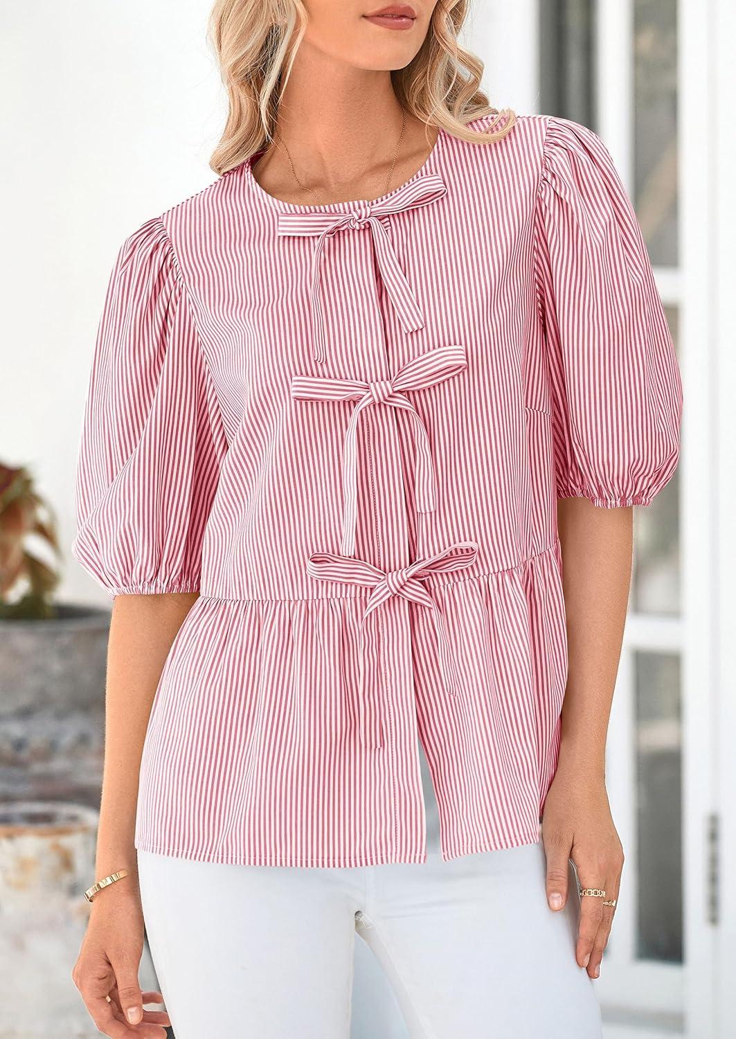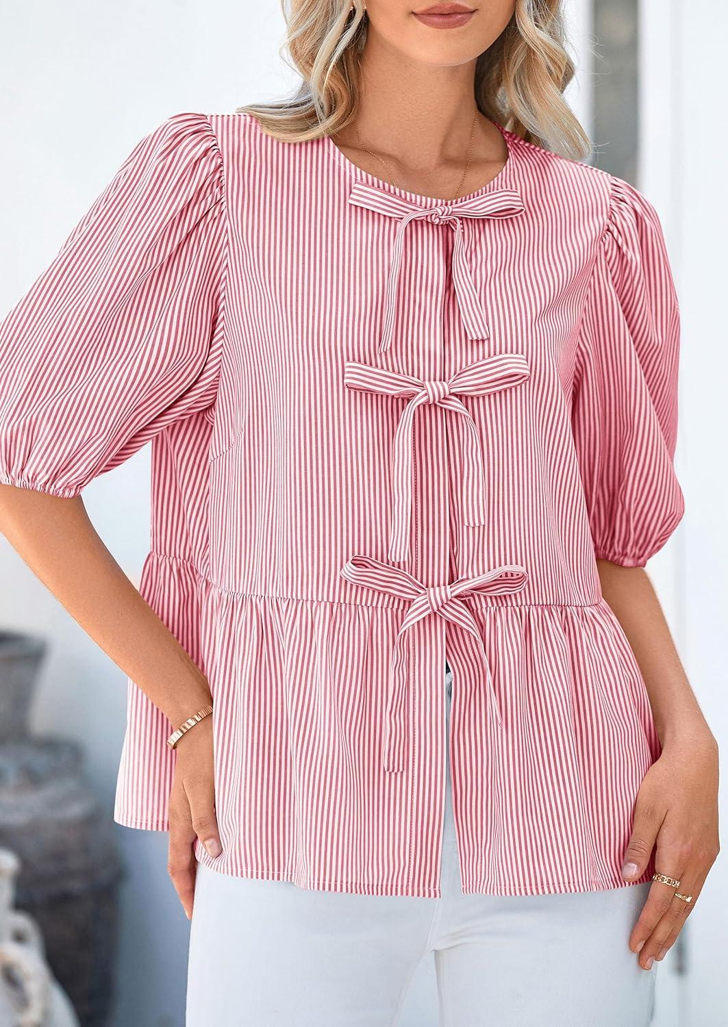 PRETTYGARDEN Women’s Tie Front Striped Shirt 2025 Summer Trendy Fashion Cute Babydoll Tops Peplum Puffy Sleeve Blouse(Red)