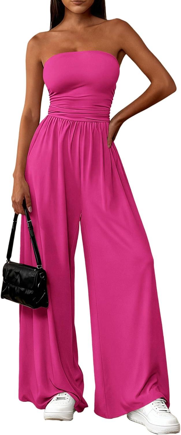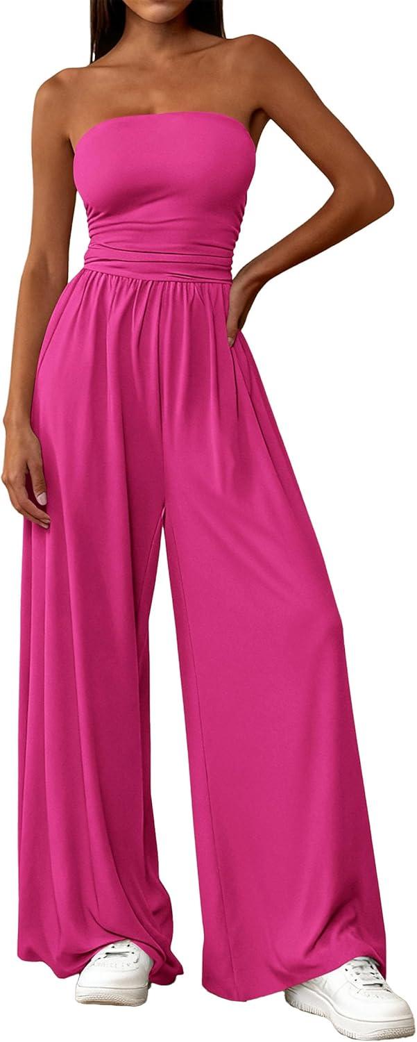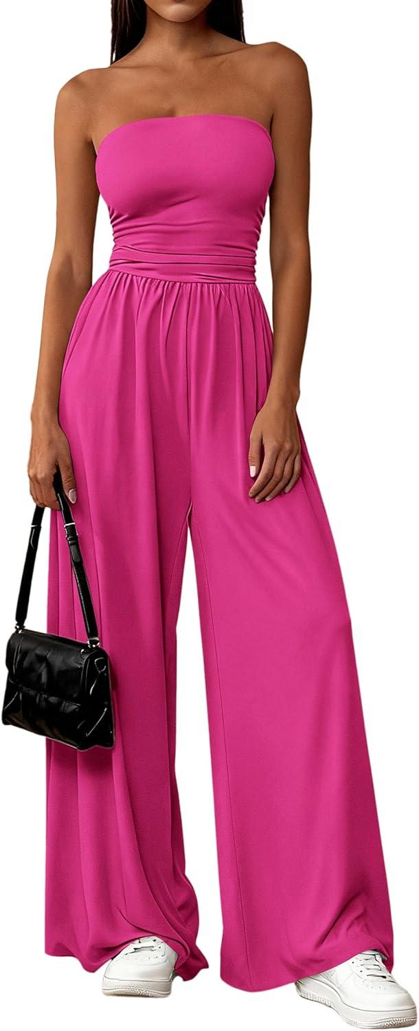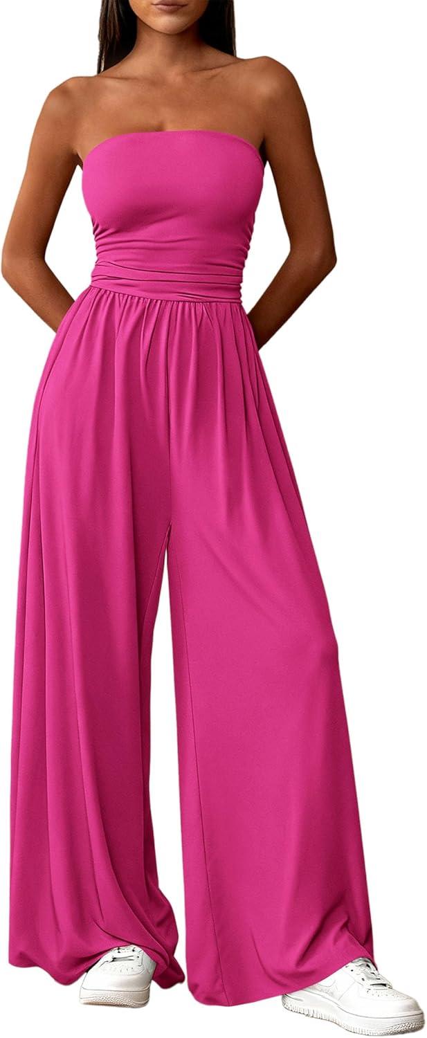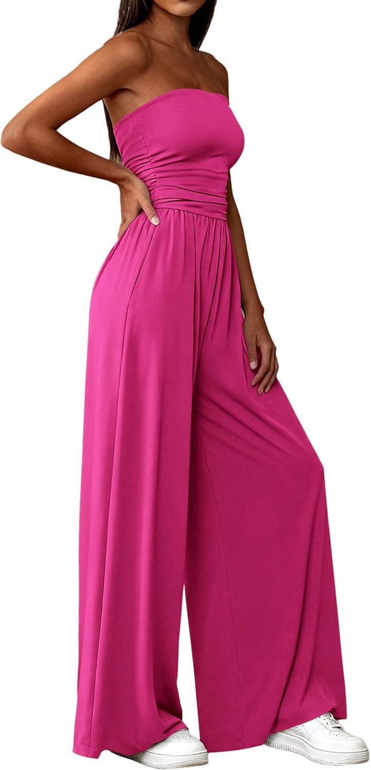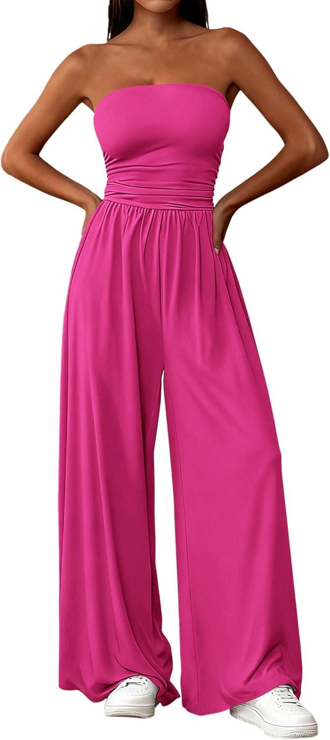 PRETTYGARDEN Womens Trendy Strapless Rompers 2026 Ruched Tube Top Wide Leg One Piece Jumpsuits Beach Vacation Summer Outfits(Rose Red)