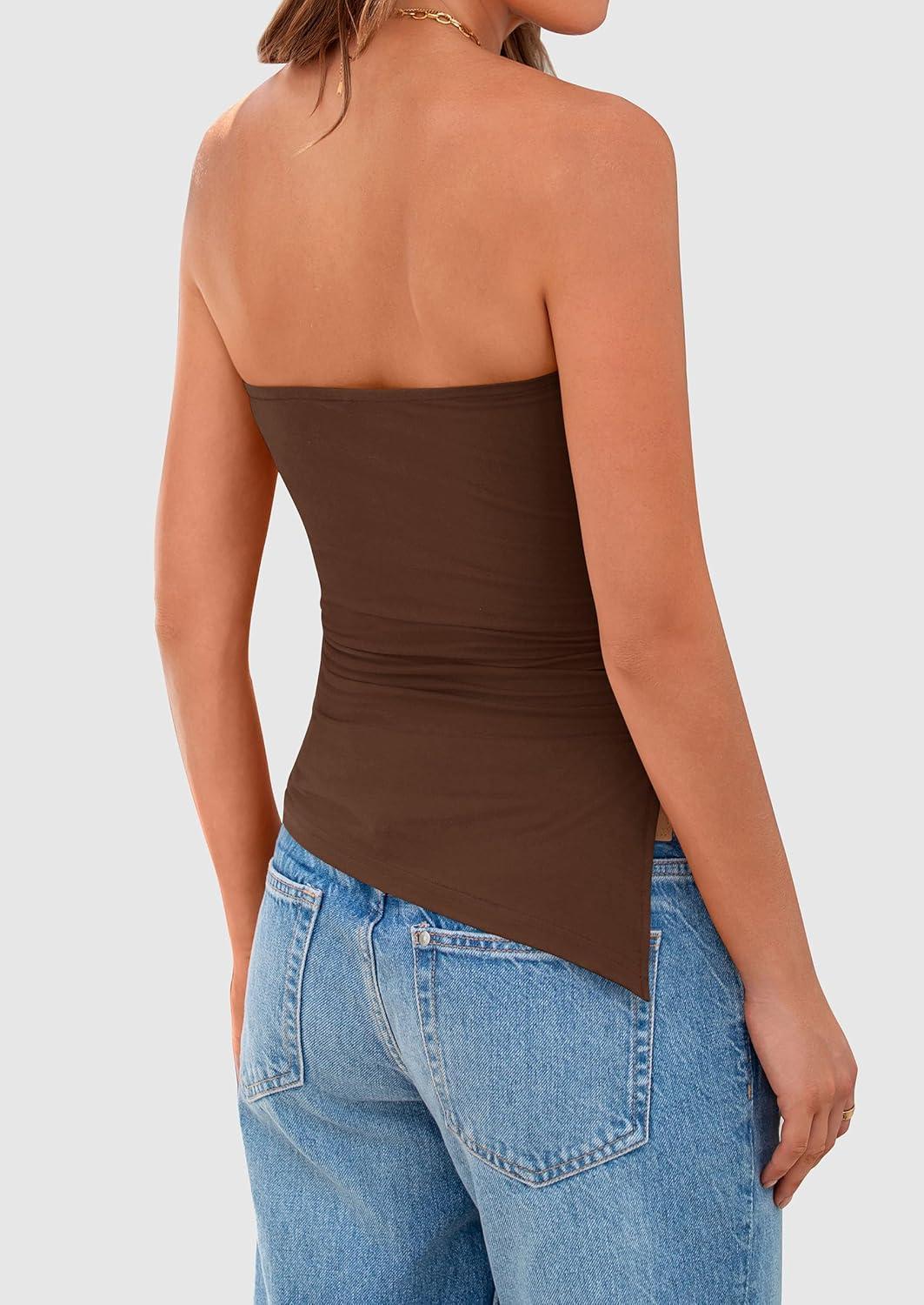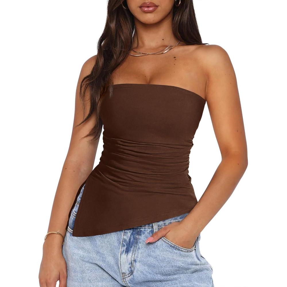 PRETTYGARDEN Womens Tube Top 2025 Summer Trendy Strapless Tops Going Out Outfits Ruched Asymmetrical Bandeau Shirts(Brown)