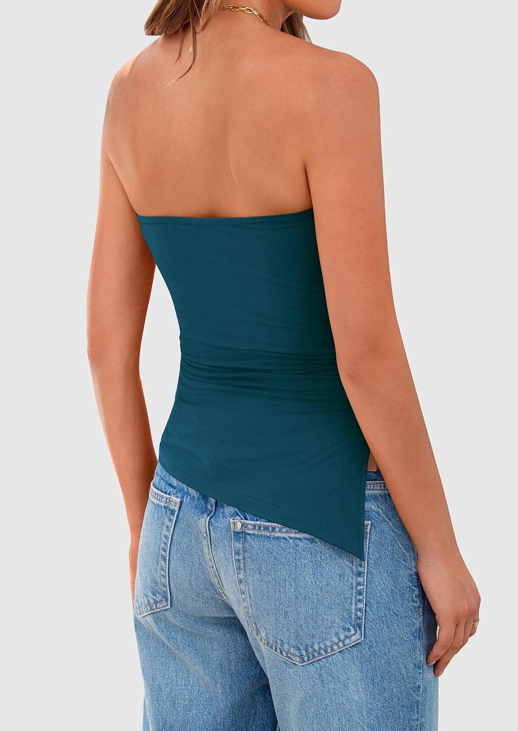 PRETTYGARDEN Womens Tube Top 2025 Summer Trendy Strapless Tops Going Out Outfits Ruched Asymmetrical Bandeau Shirts(Dark Blue)