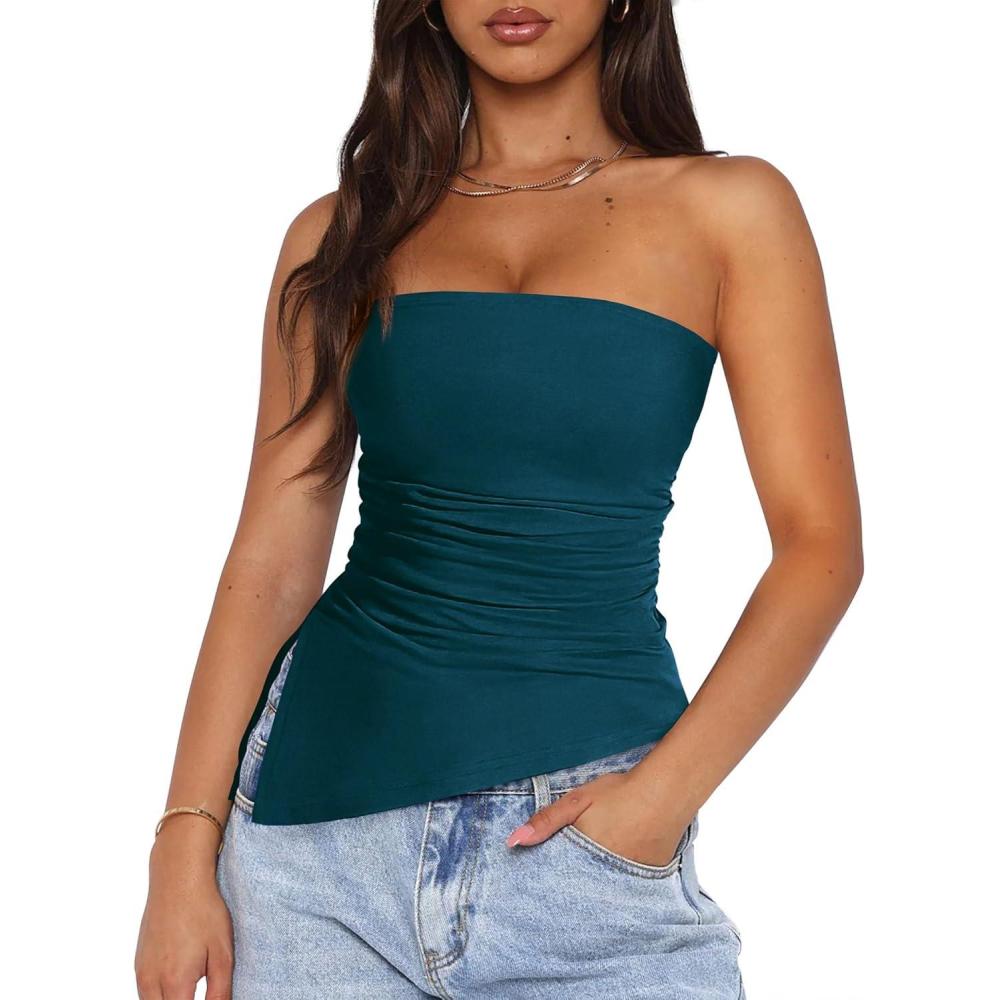 PRETTYGARDEN Womens Tube Top 2025 Summer Trendy Strapless Tops Going Out Outfits Ruched Asymmetrical Bandeau Shirts(Dark Green)
