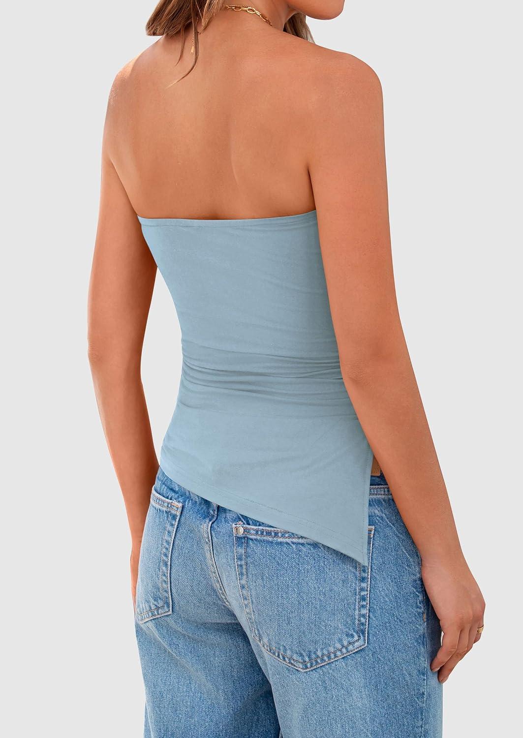 PRETTYGARDEN Womens Tube Top 2025 Summer Trendy Strapless Tops Going Out Outfits Ruched Asymmetrical Bandeau Shirts(Light Blue)
