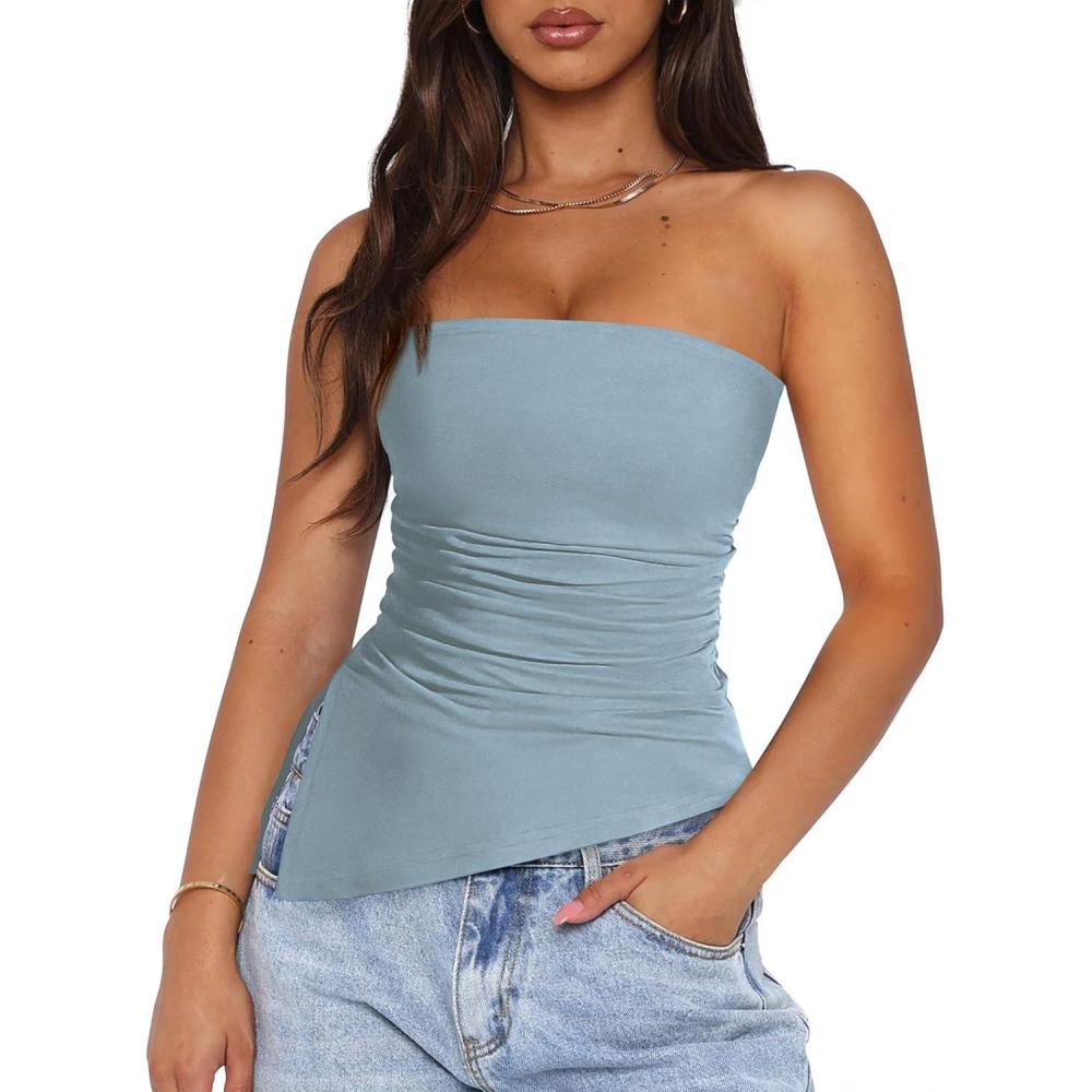 PRETTYGARDEN Womens Tube Top 2025 Summer Trendy Strapless Tops Going Out Outfits Ruched Asymmetrical Bandeau Shirts(Light Grey Blue)