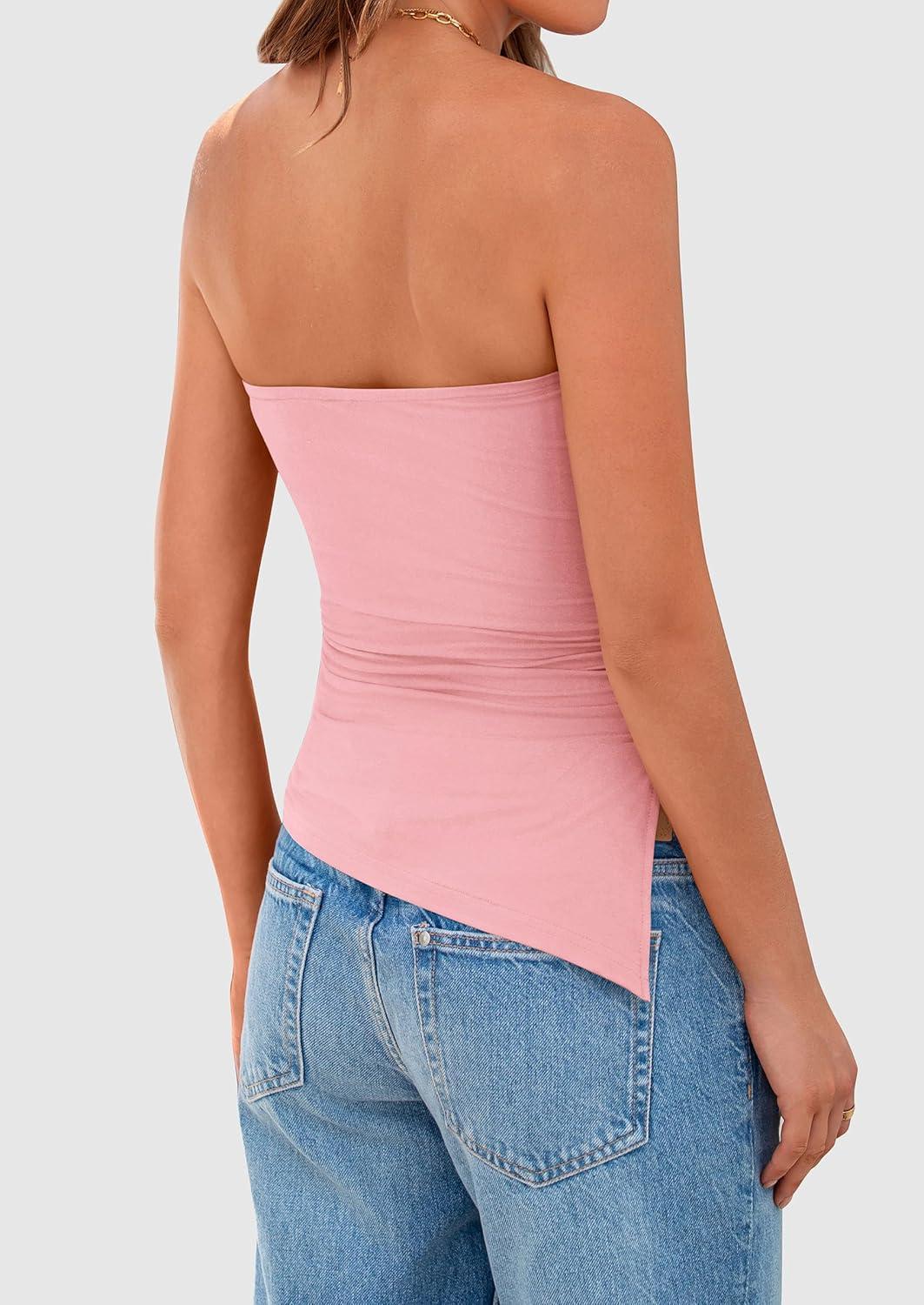 PRETTYGARDEN Womens Tube Top 2025 Summer Trendy Strapless Tops Going Out Outfits Ruched Asymmetrical Bandeau Shirts(Pink)