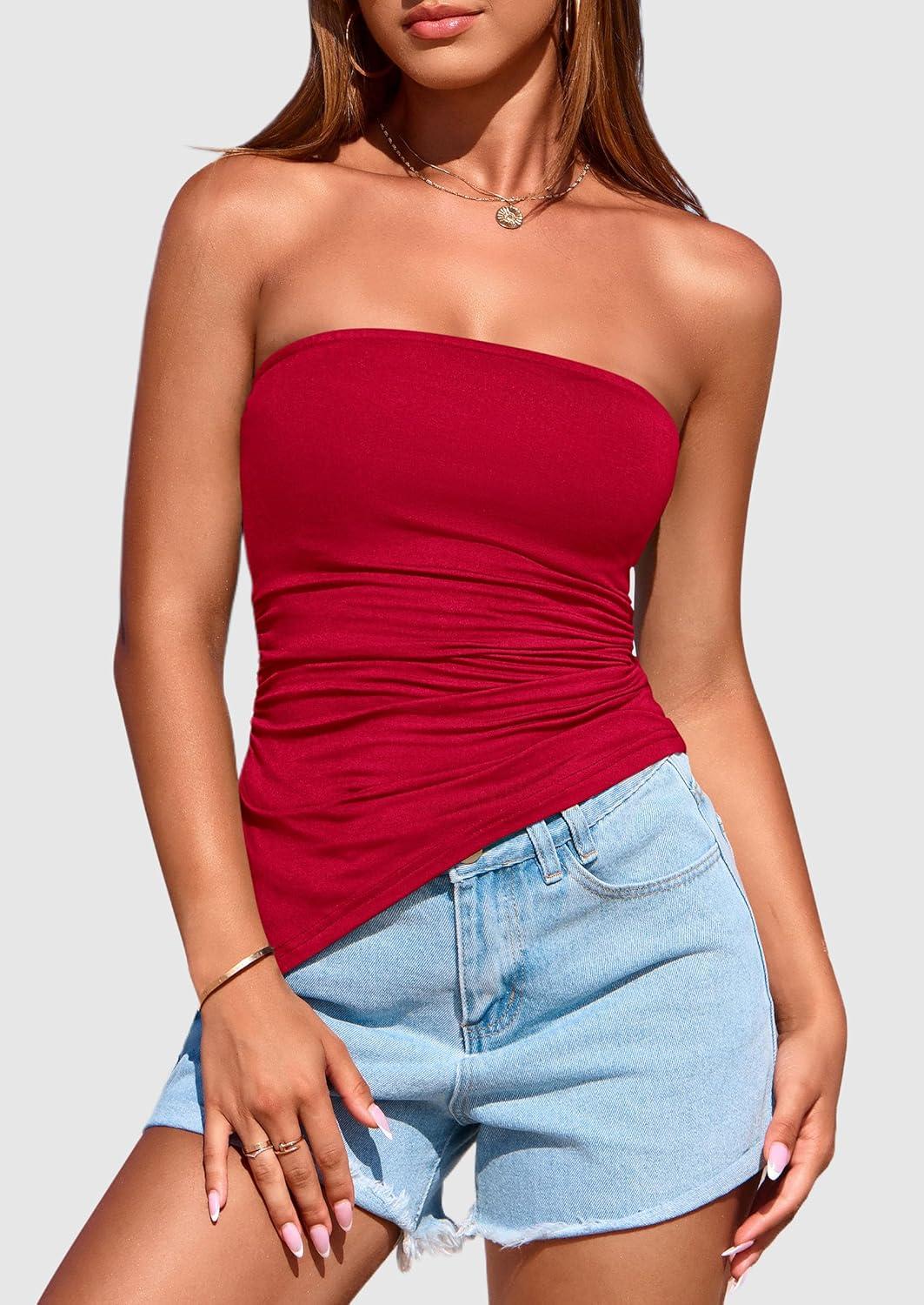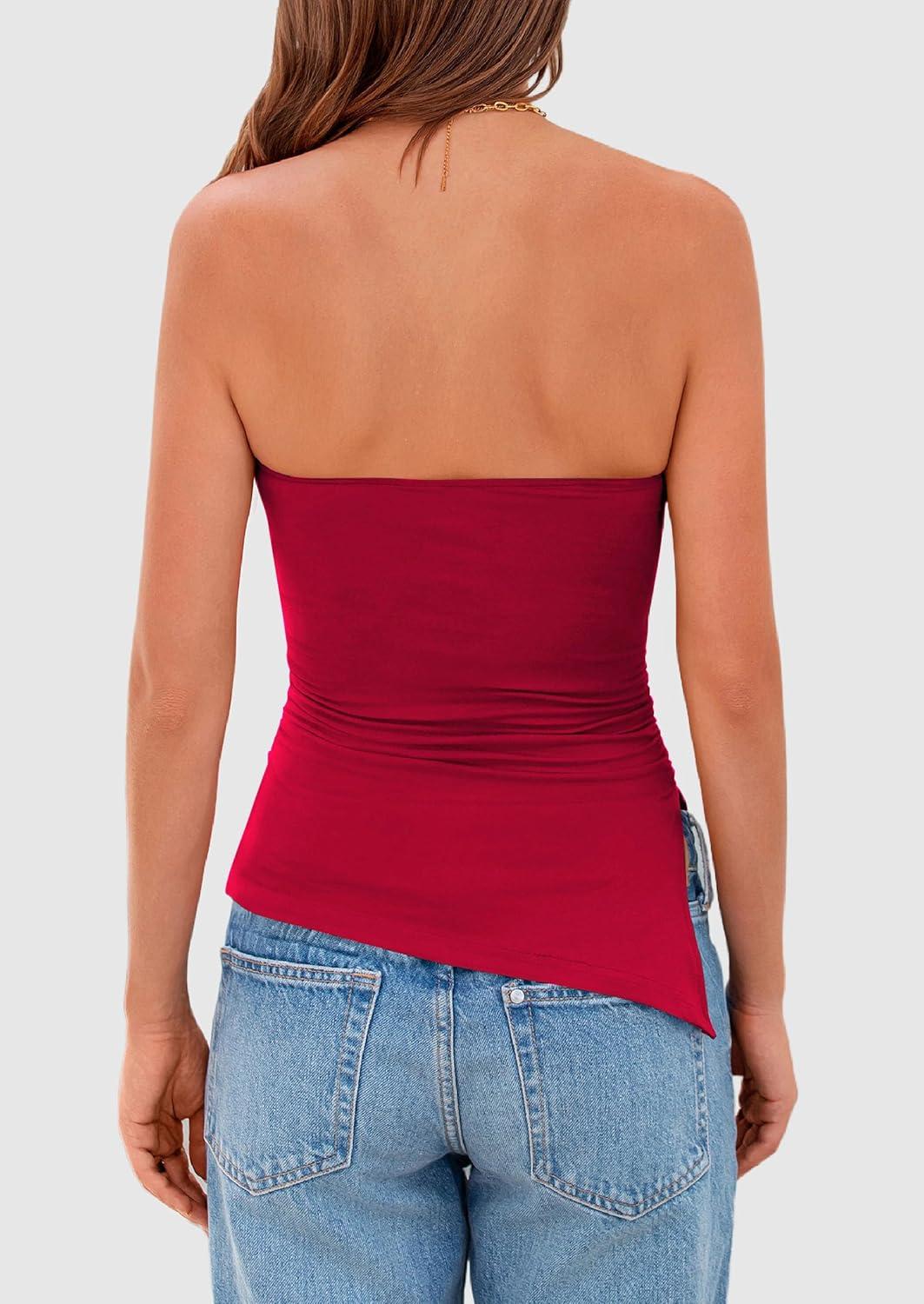 PRETTYGARDEN Womens Tube Top 2025 Summer Trendy Strapless Tops Going Out Outfits Ruched Asymmetrical Bandeau Shirts(Red)