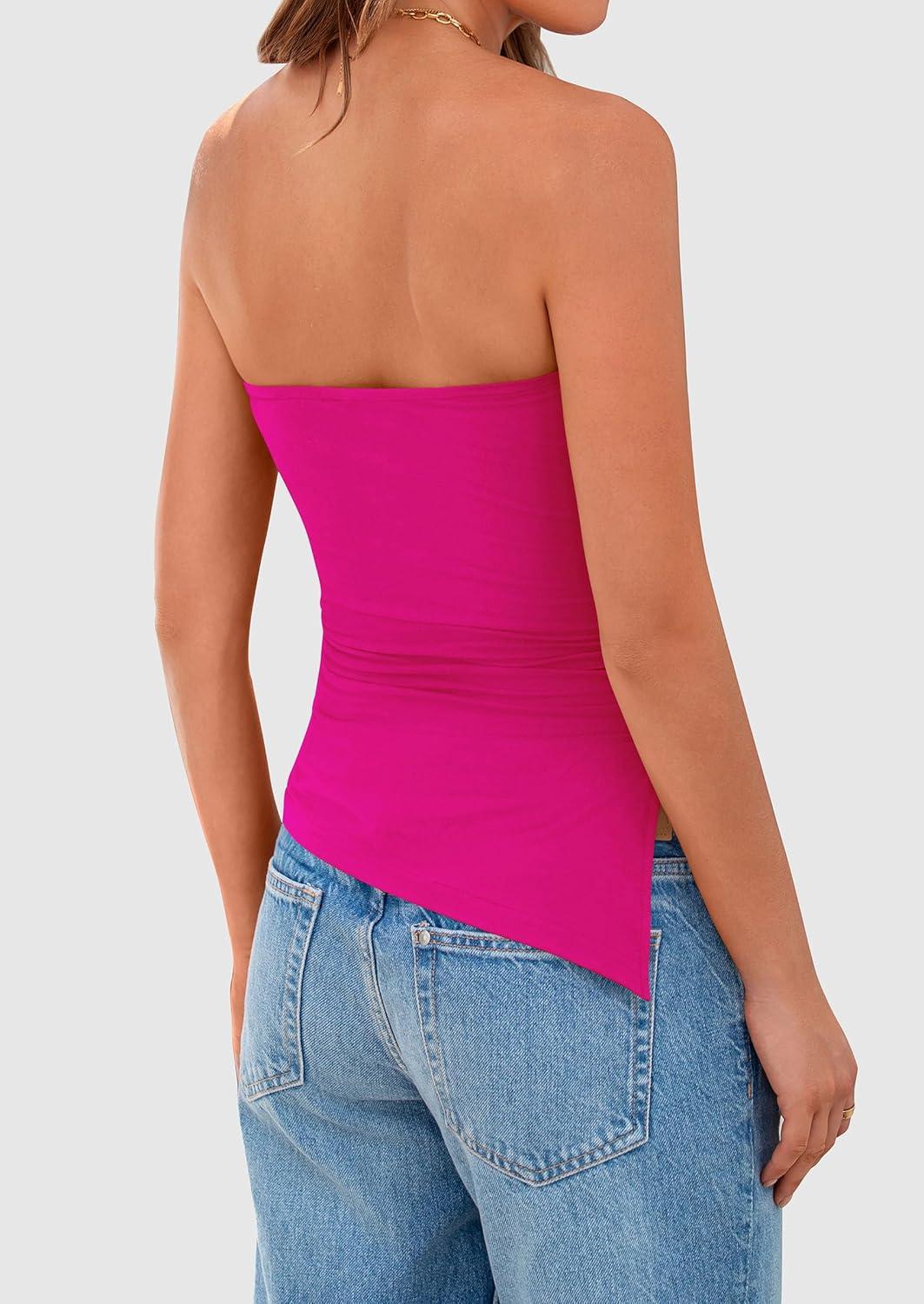 PRETTYGARDEN Womens Tube Top 2025 Summer Trendy Strapless Tops Going Out Outfits Ruched Asymmetrical Bandeau Shirts(Rose Red)