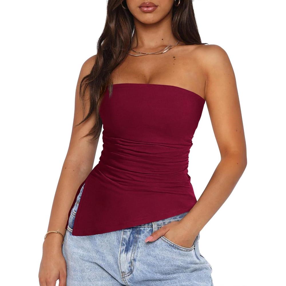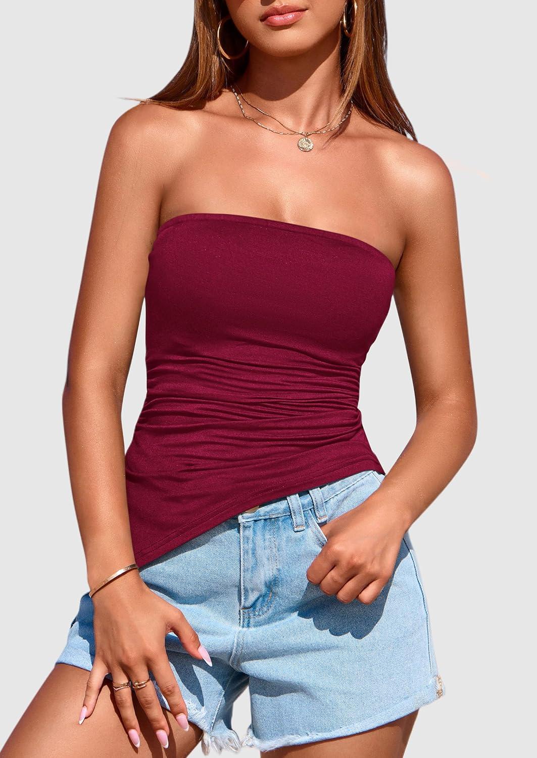 PRETTYGARDEN Womens Tube Top 2025 Summer Trendy Strapless Tops Going Out Outfits Ruched Asymmetrical Bandeau Shirts(Wine Red)