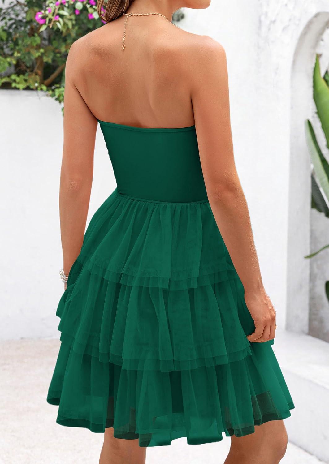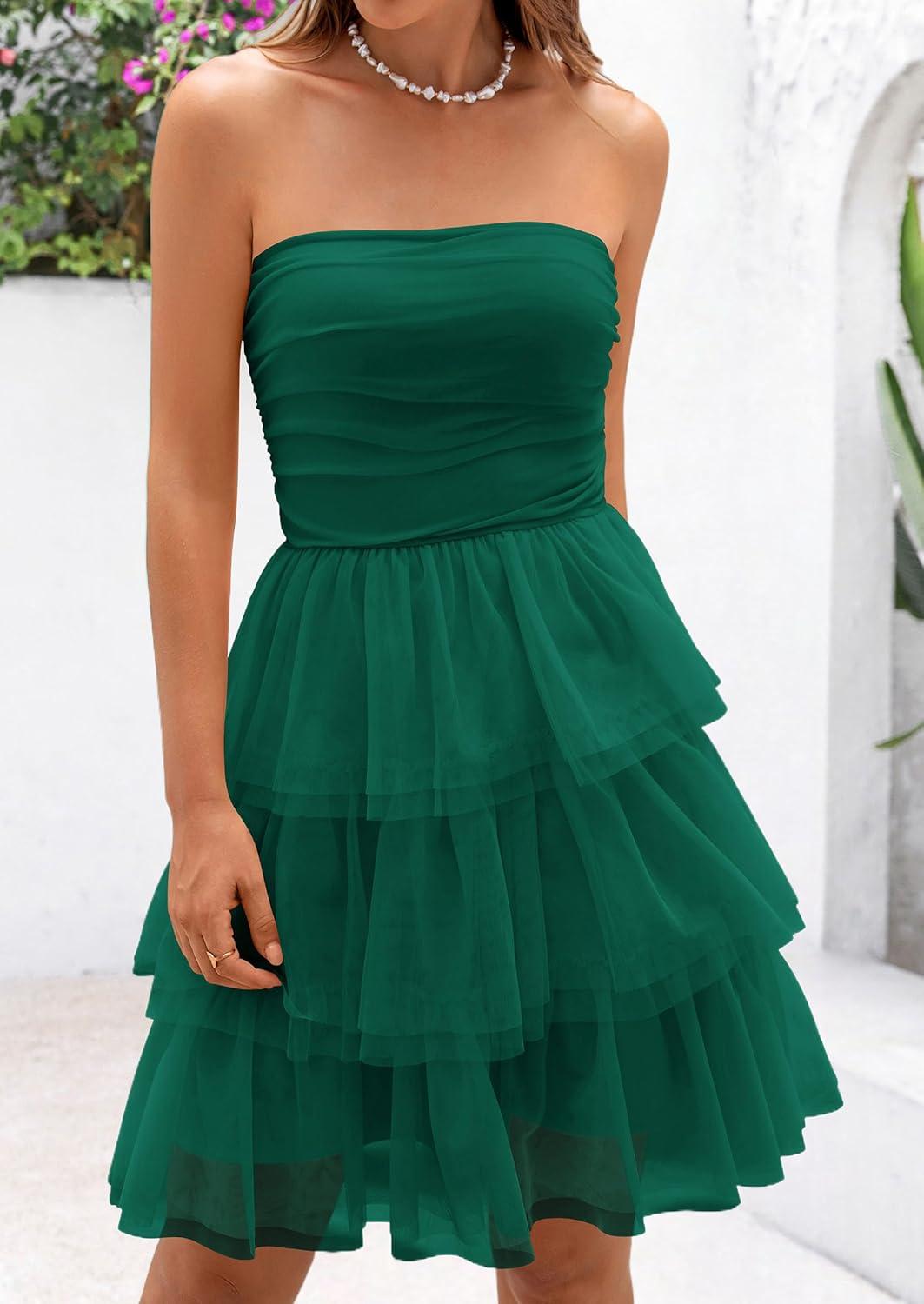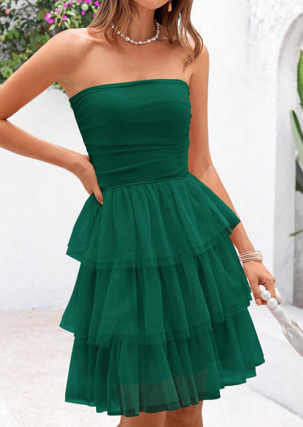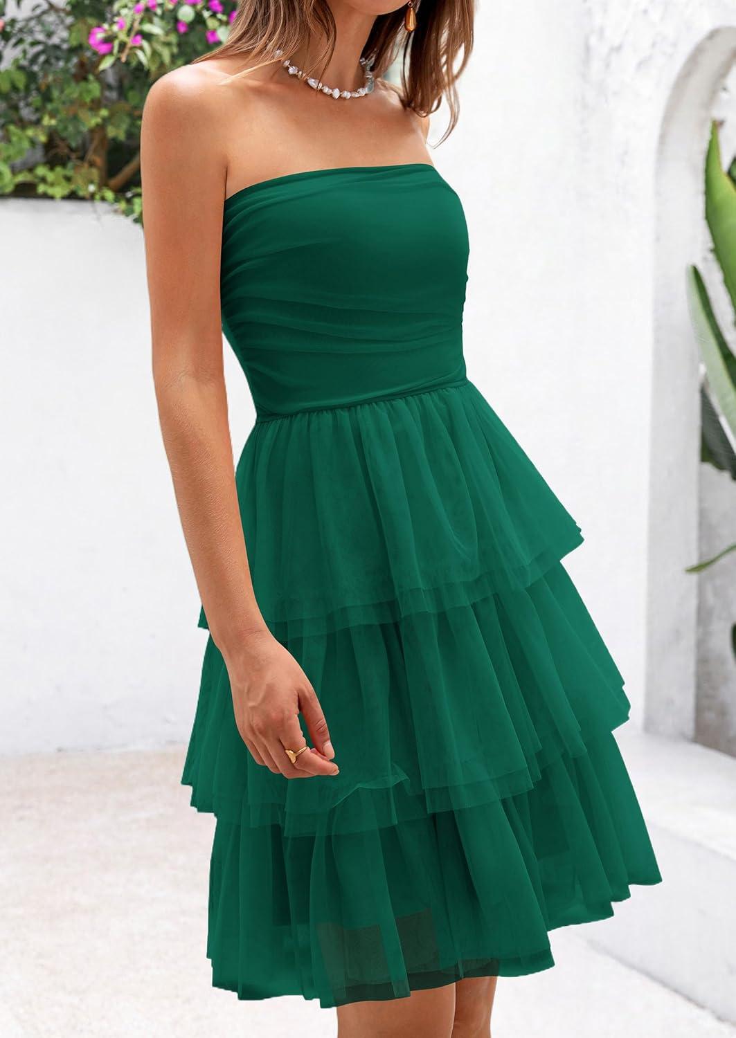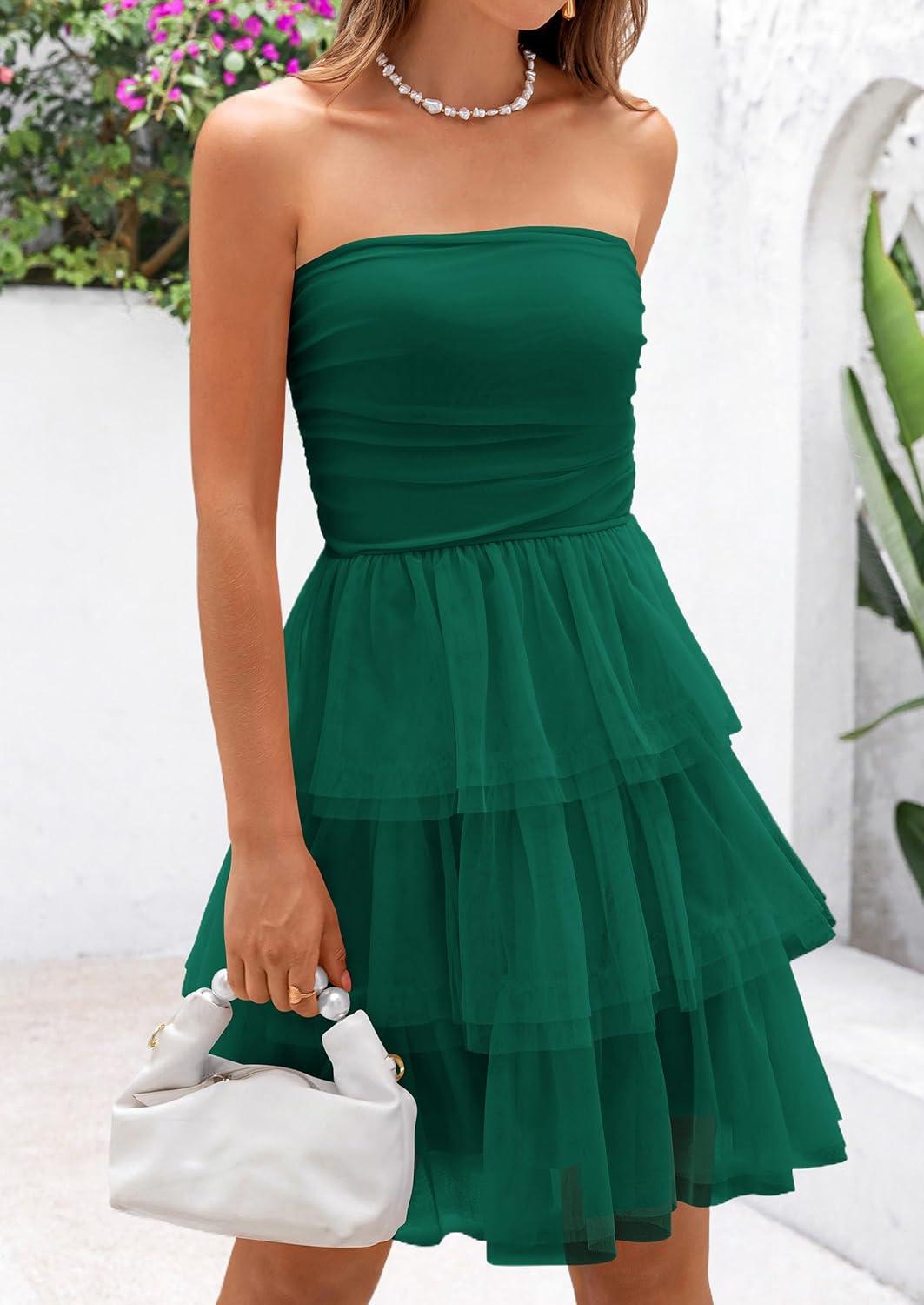 PRETTYGARDEN Womens Tulle Dress Strapless Tube Top Short Dress Summer Ruffle Tiered Party Wedding Guest Dresses(Dark Green)