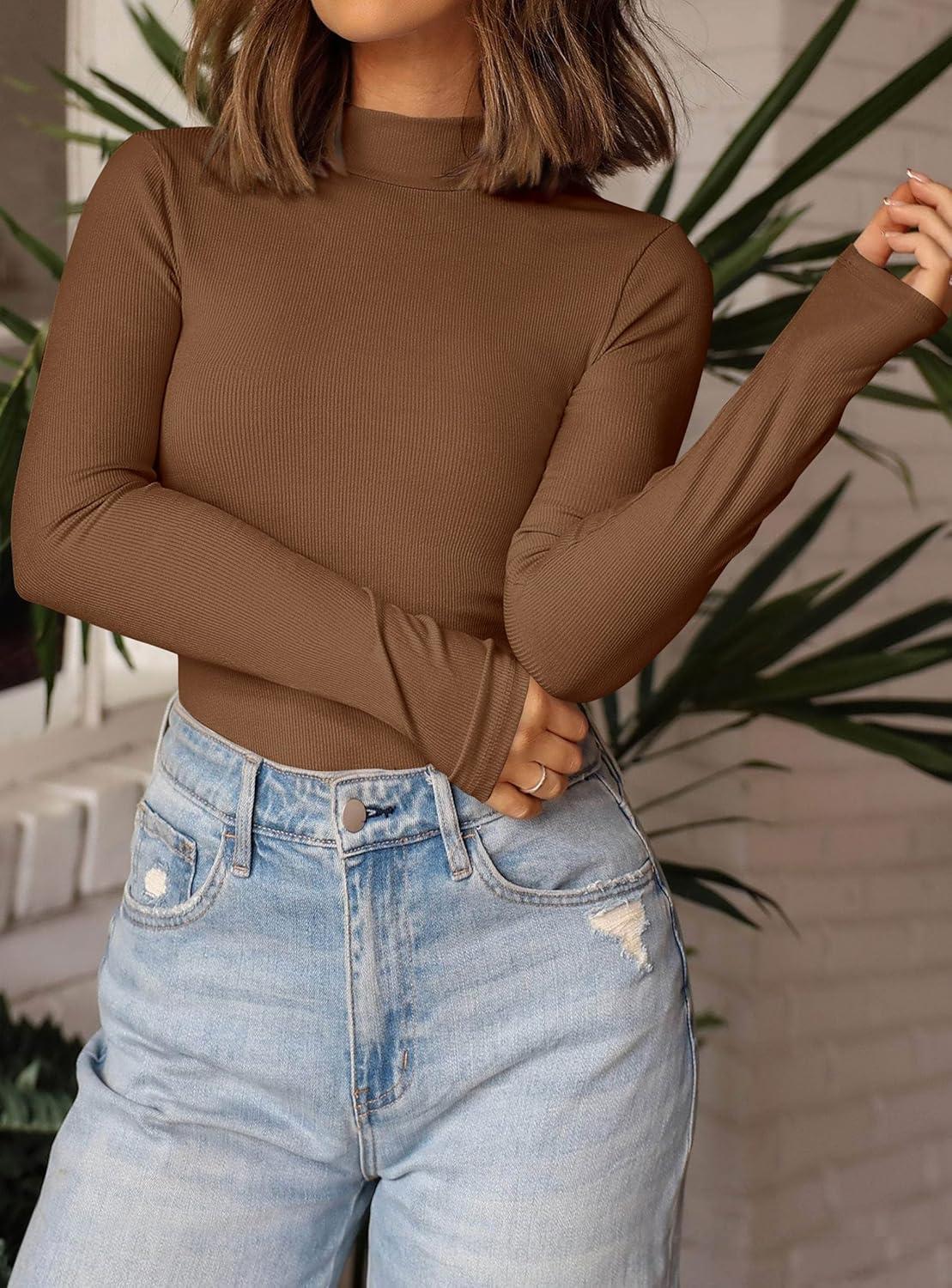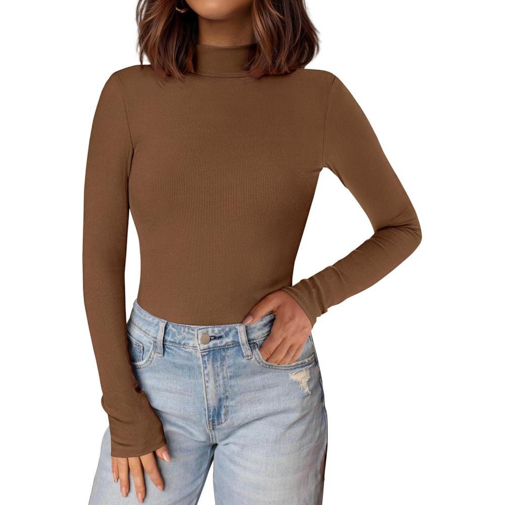 PRETTYGARDEN Women’s Turtleneck Long Sleeve Shirts 2025 Fall Basic Tees Ribbed Fitted Tops Thermal Layering Knit Top Clothes(Brown)