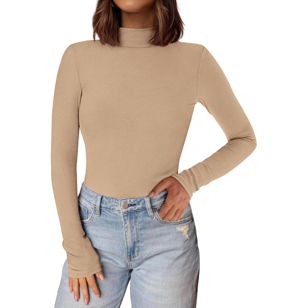 PRETTYGARDEN Women’s Turtleneck Long Sleeve Shirts 2025 Fall Basic Tees Ribbed Fitted Tops Thermal Layering Knit Top Clothes(Khaki)