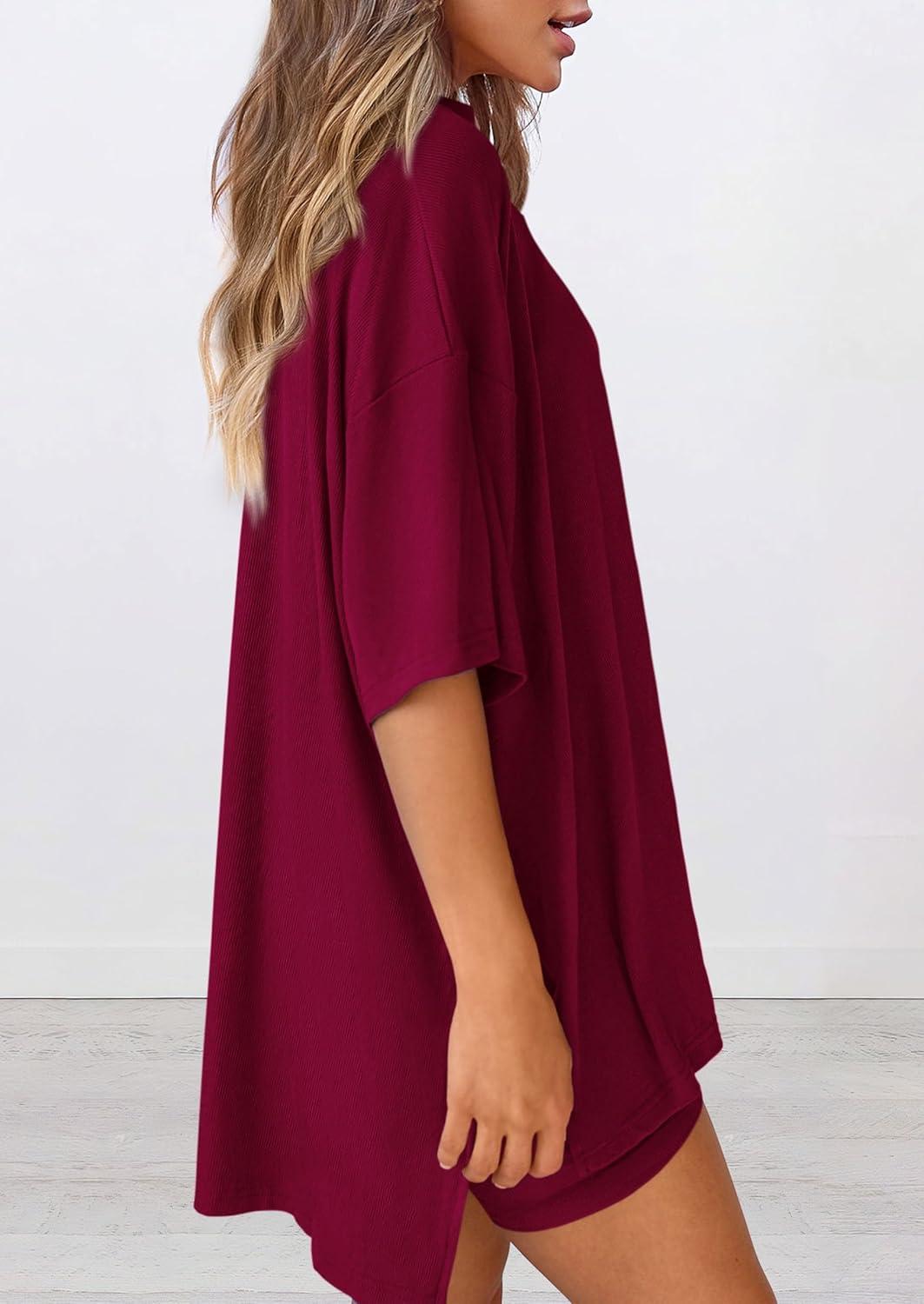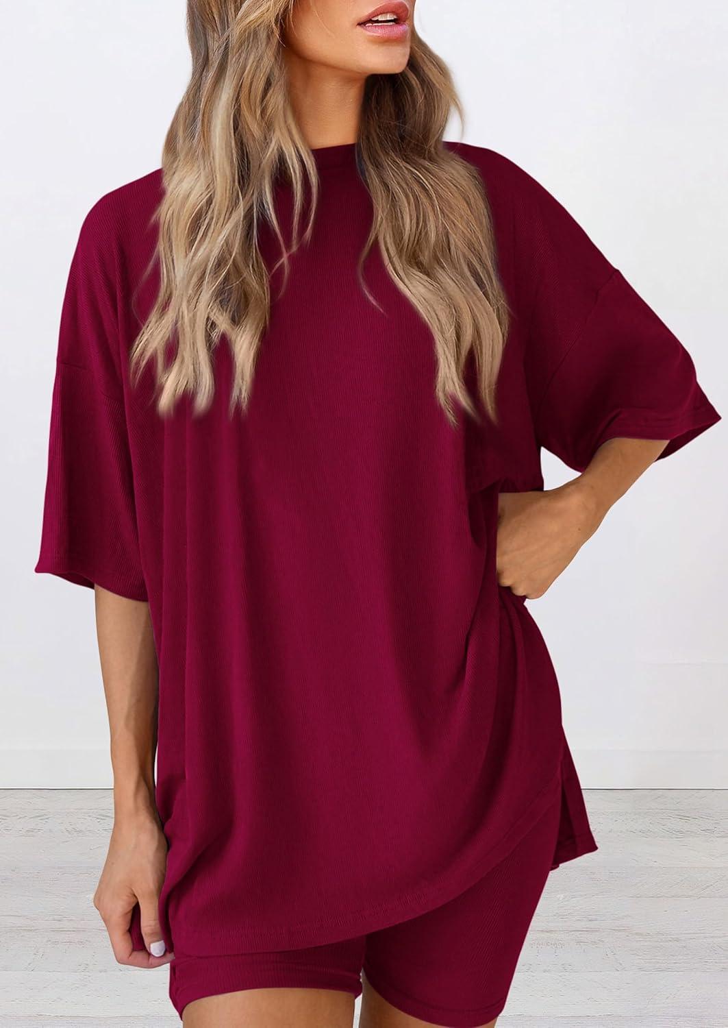 PRETTYGARDEN Women's Two Piece Lounge Set 2025 Summer Casual Oversized Shirts Biker Shorts Matching Airport Travel Outfit(Deep Red)