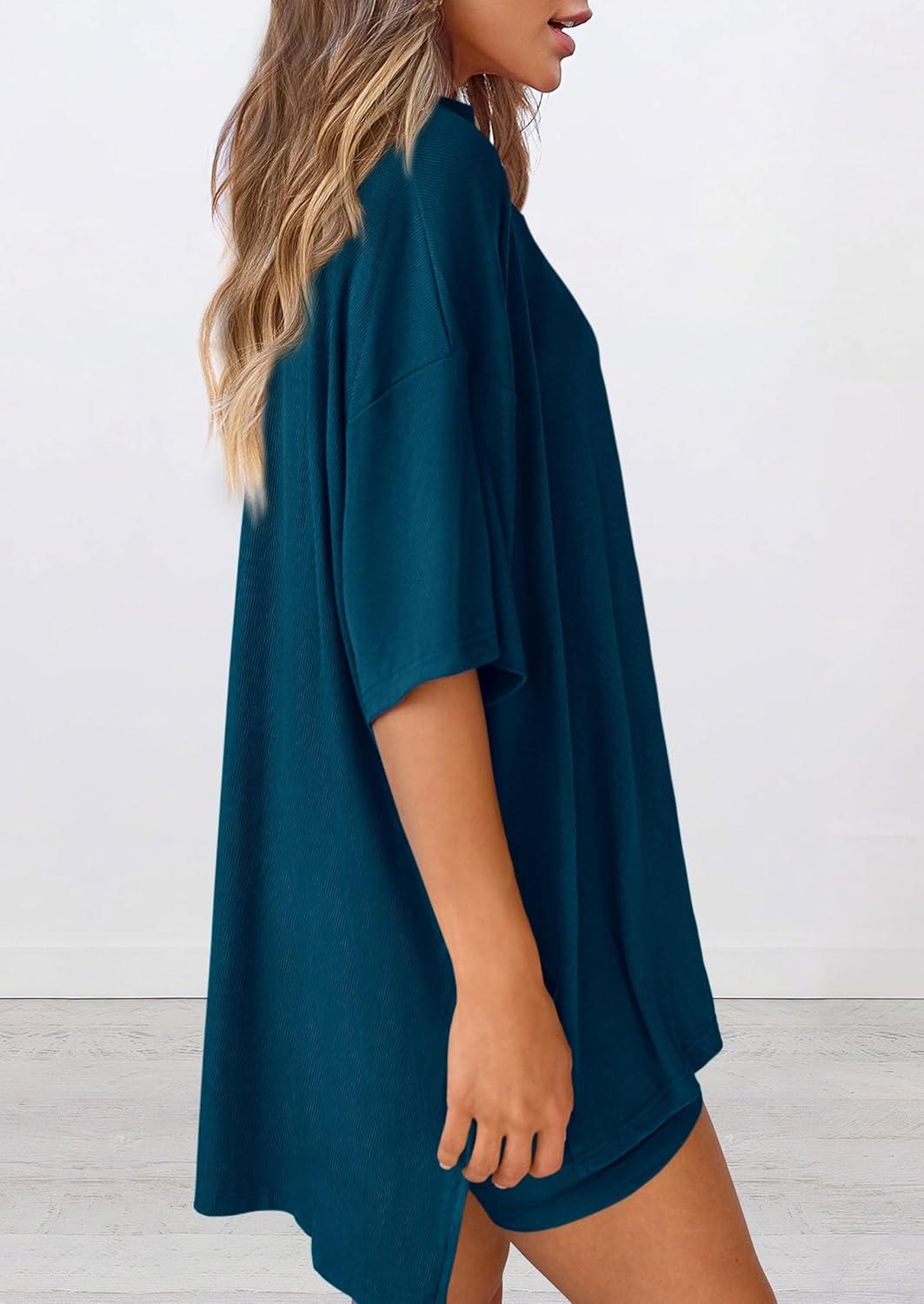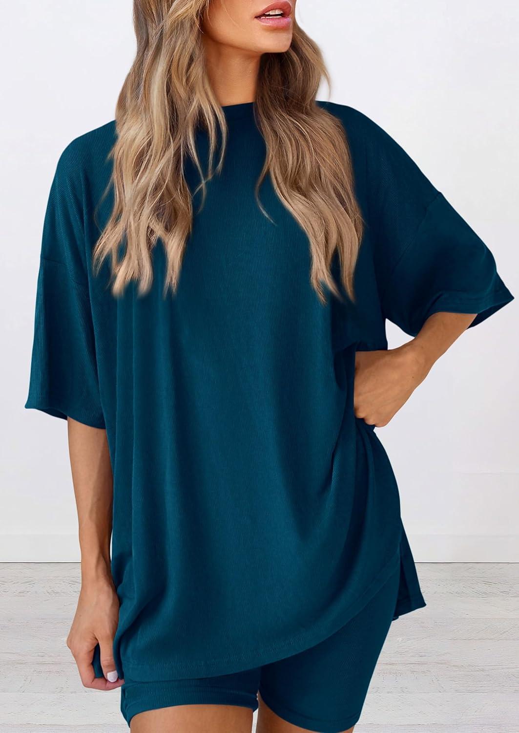 PRETTYGARDEN Women's Two Piece Lounge Set 2025 Summer Casual Oversized Shirts Biker Shorts Matching Airport Travel Outfit(Lake Blue)