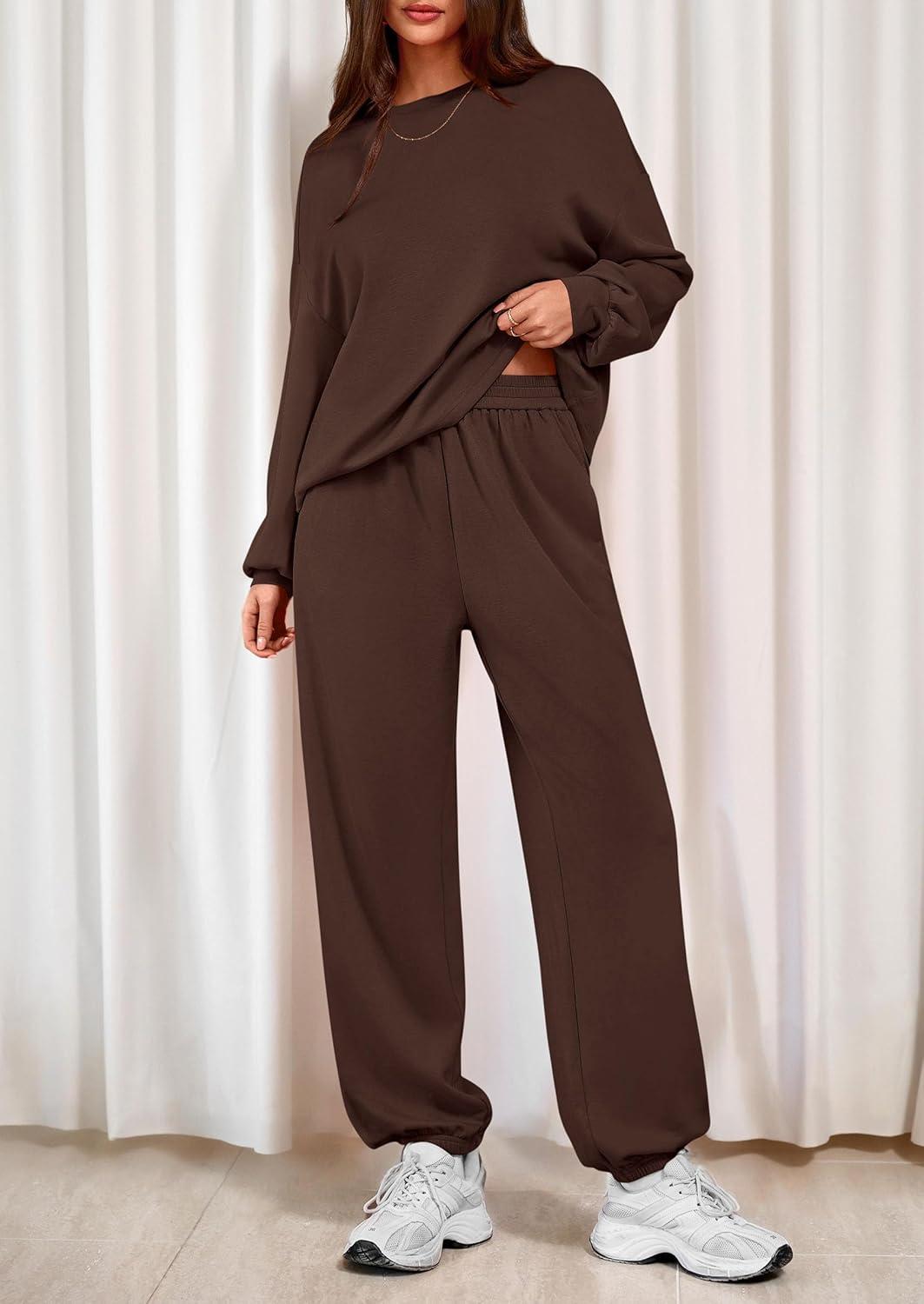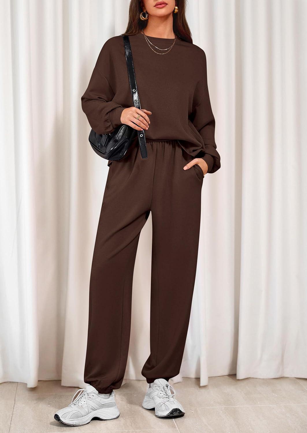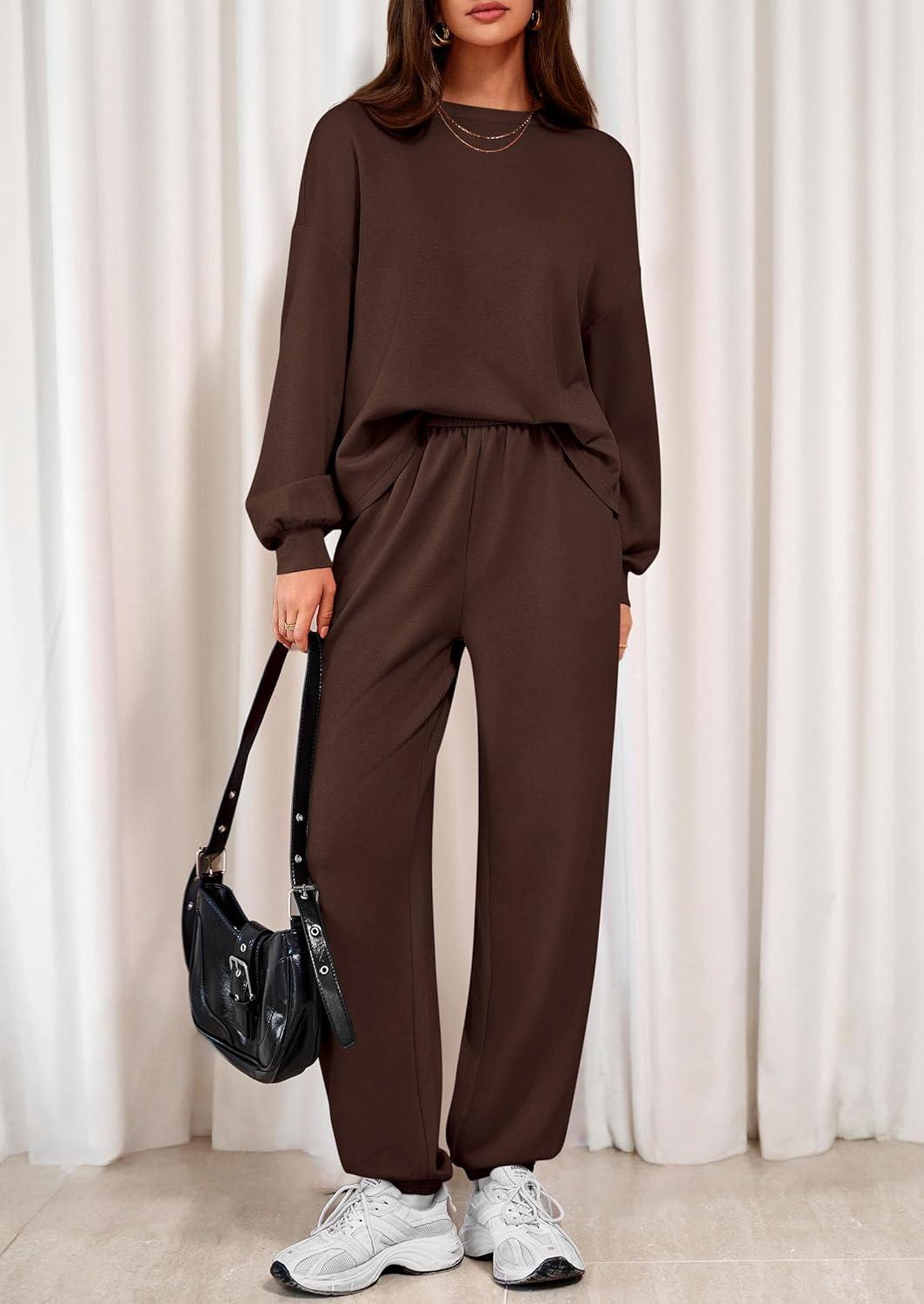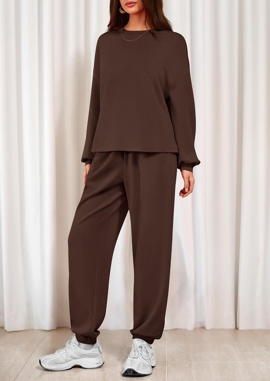 PRETTYGARDEN Women’s Two Piece Lounge Sets 2025 Fall Airport Outfits Long Sleeve Pullover Tops Sweatpants Matching Clothing(Brown)