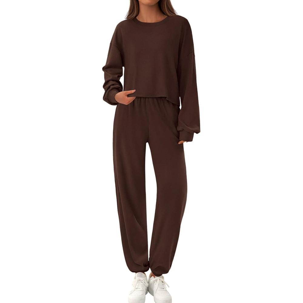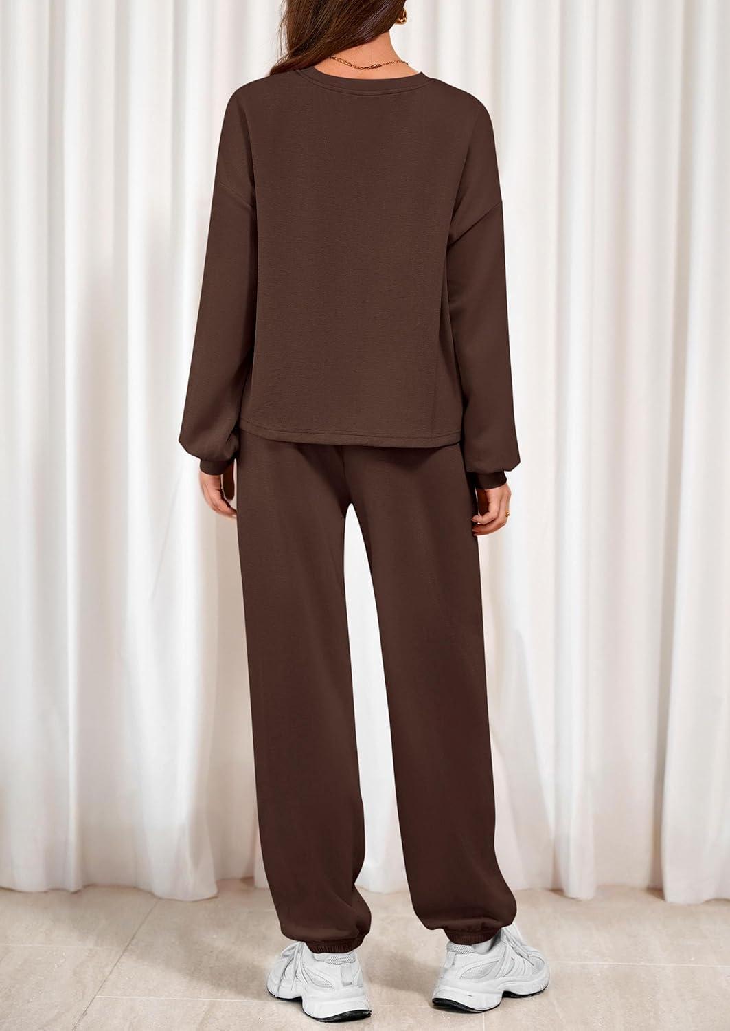 PRETTYGARDEN Women's Two Piece Lounge Sets 2025 Fall Airport Outfits Long Sleeve Pullover Tops Sweatpants Matching Clothing(Brown)