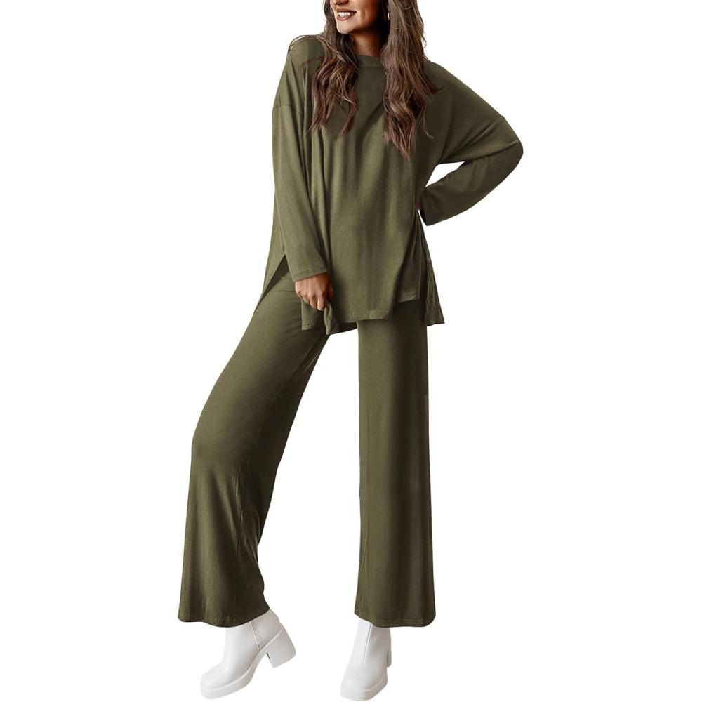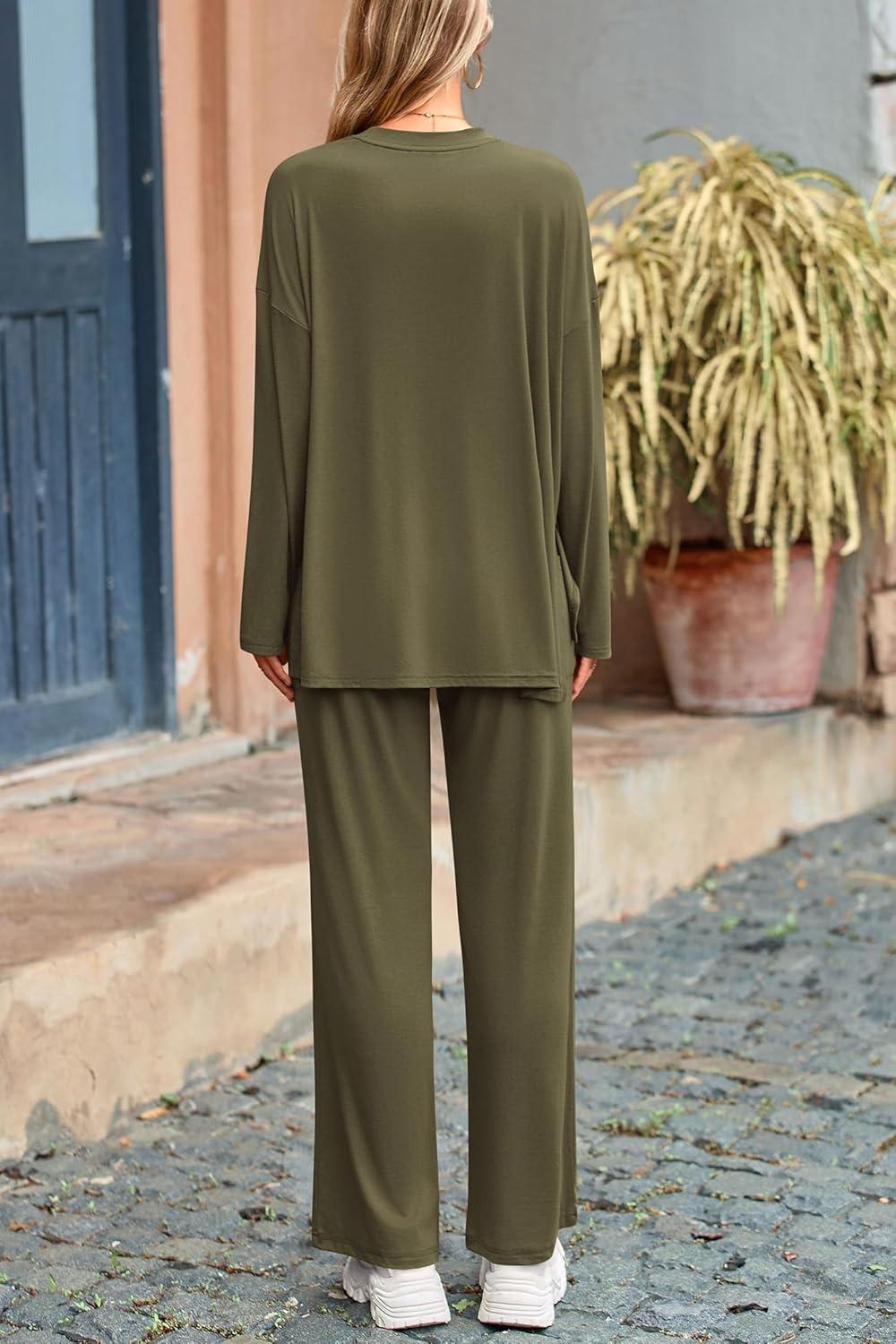 PRETTYGARDEN Women's Two Piece Lounge Sets Matching Long Sleeve Shirts Wide Leg Pants Tracksuits Travel Outfits Fall Clothes(Army Green)
