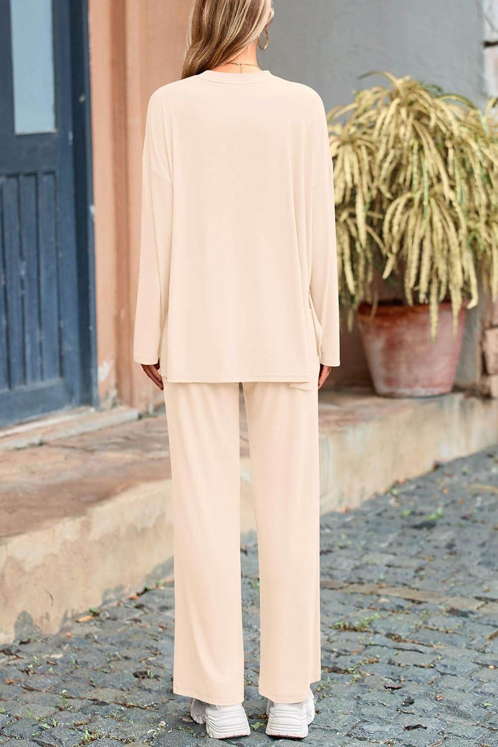 PRETTYGARDEN Women's Two Piece Lounge Sets Matching Long Sleeve Shirts Wide Leg Pants Tracksuits Travel Outfits Fall Clothes(Beige)