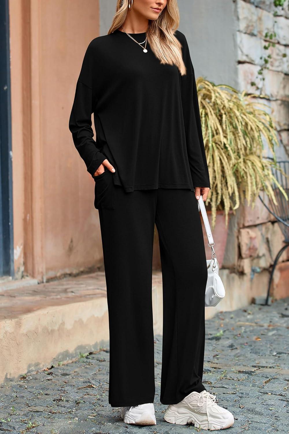 PRETTYGARDEN Women's Two Piece Lounge Sets Matching Long Sleeve Shirts Wide Leg Pants Tracksuits Travel Outfits Fall Clothes(Black)