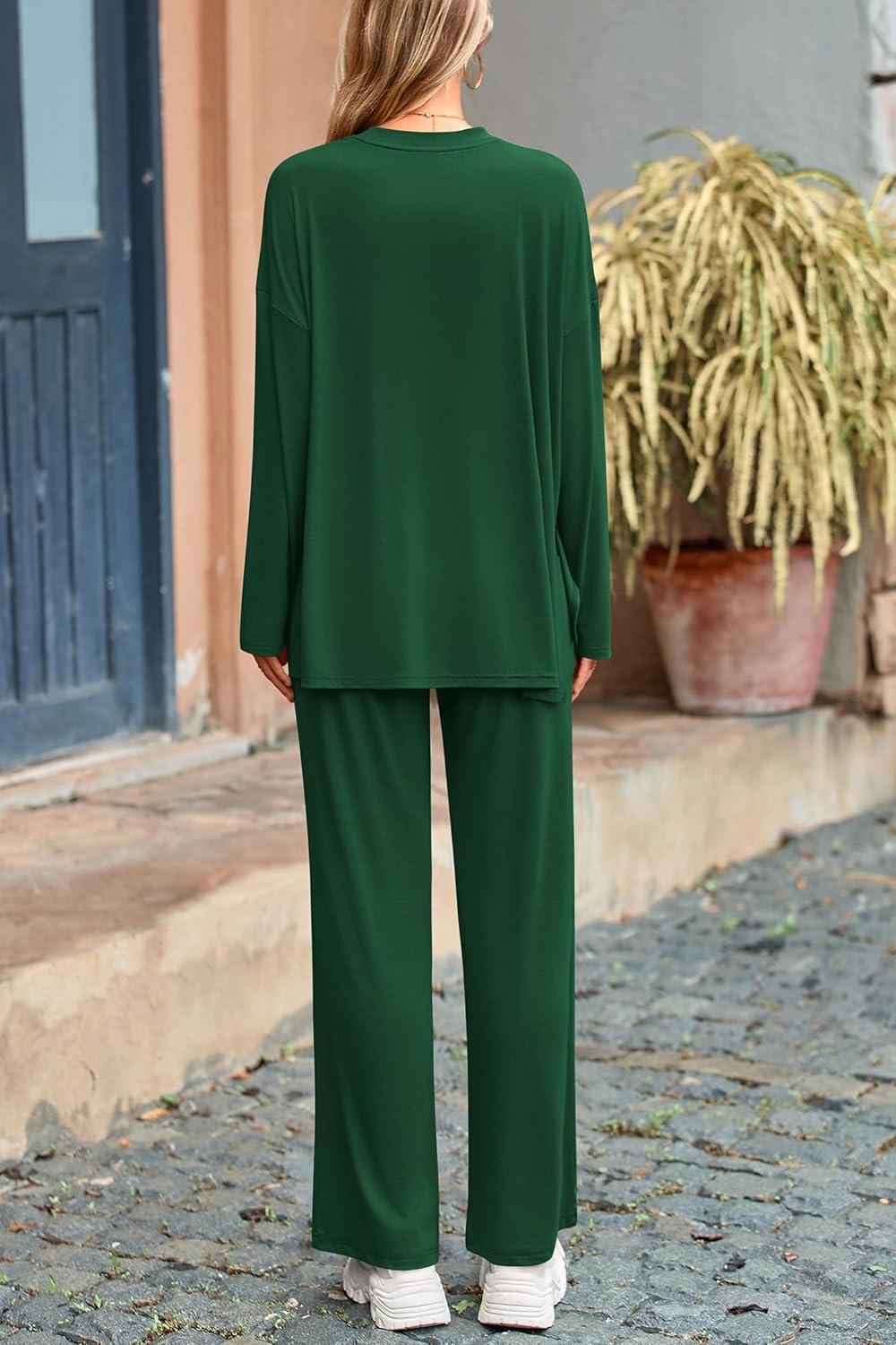 PRETTYGARDEN Women's Two Piece Lounge Sets Matching Long Sleeve Shirts Wide Leg Pants Tracksuits Travel Outfits Fall Clothes(Dark Green)