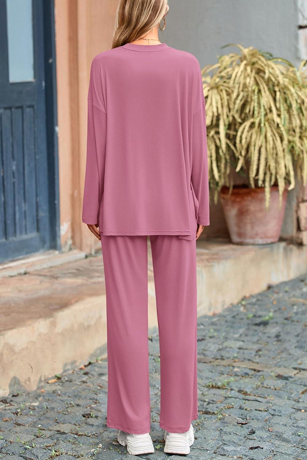 PRETTYGARDEN Women’s Two Piece Lounge Sets Matching Long Sleeve Shirts Wide Leg Pants Tracksuits Travel Outfits Fall Clothes(Pink)