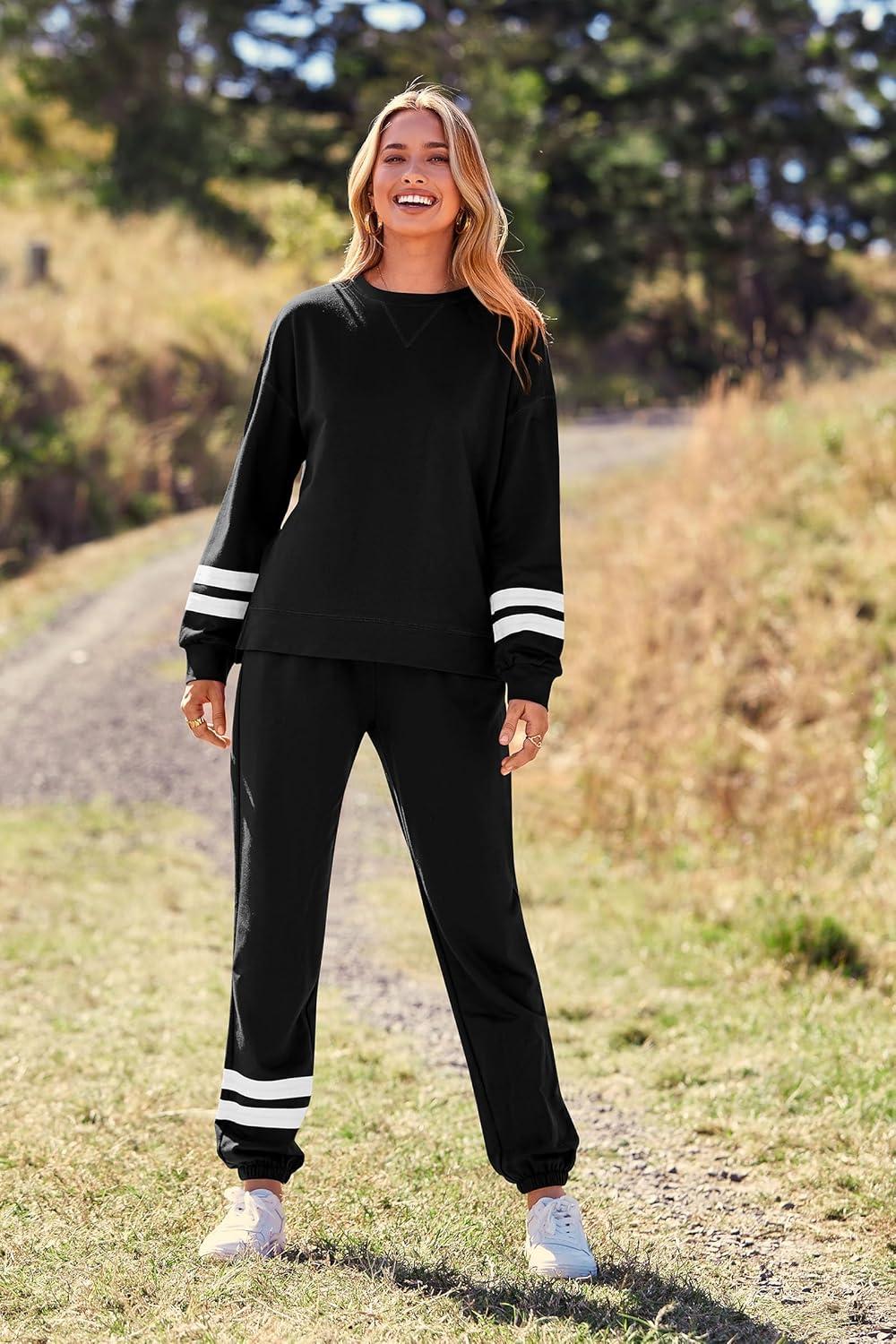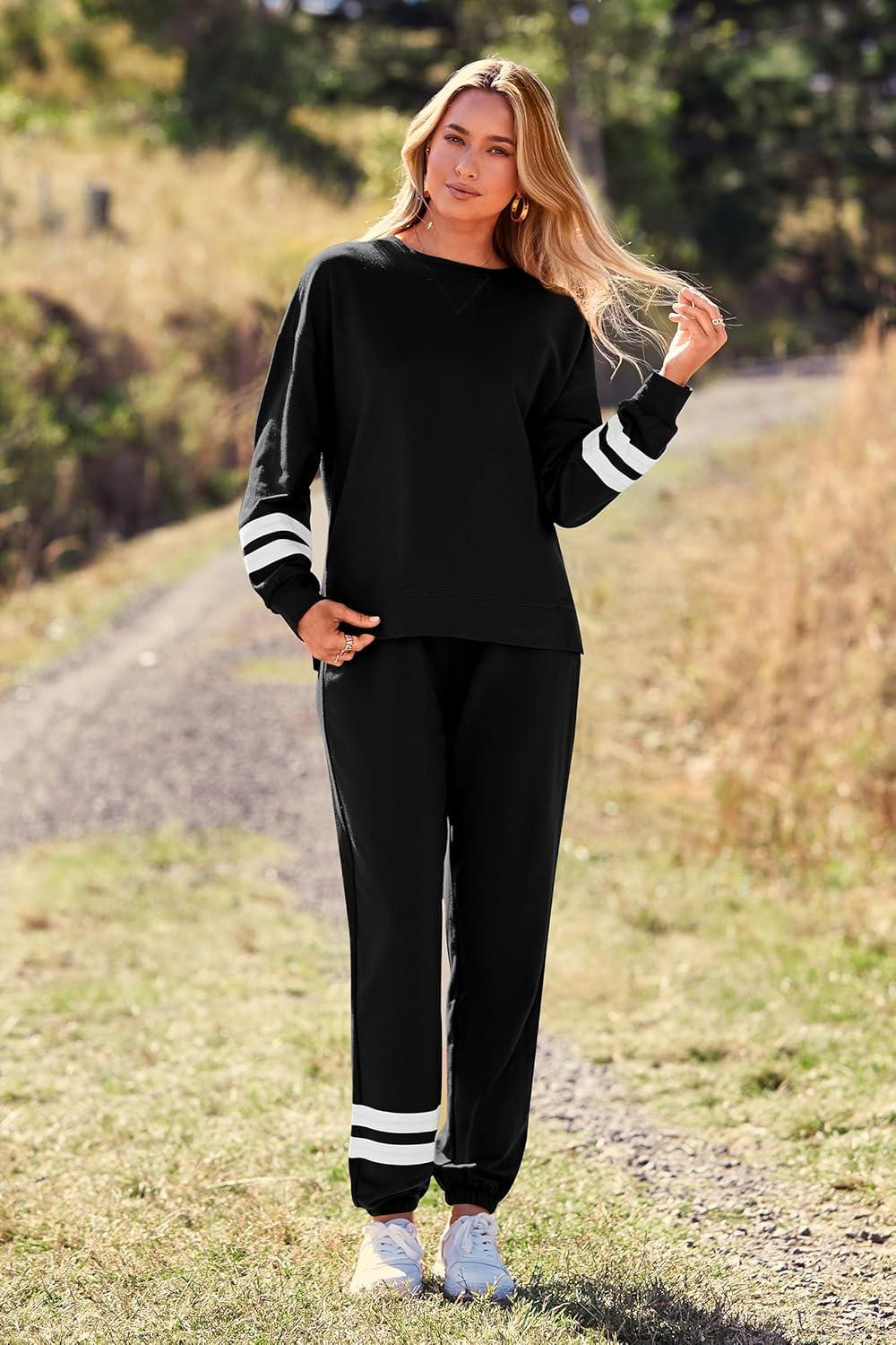 PRETTYGARDEN Women’s Two Piece Loungewear Fall Casual Long Sleeve Tops Jogger Pants Pajama Sets Matching Outfits Clothing(Striped Black)