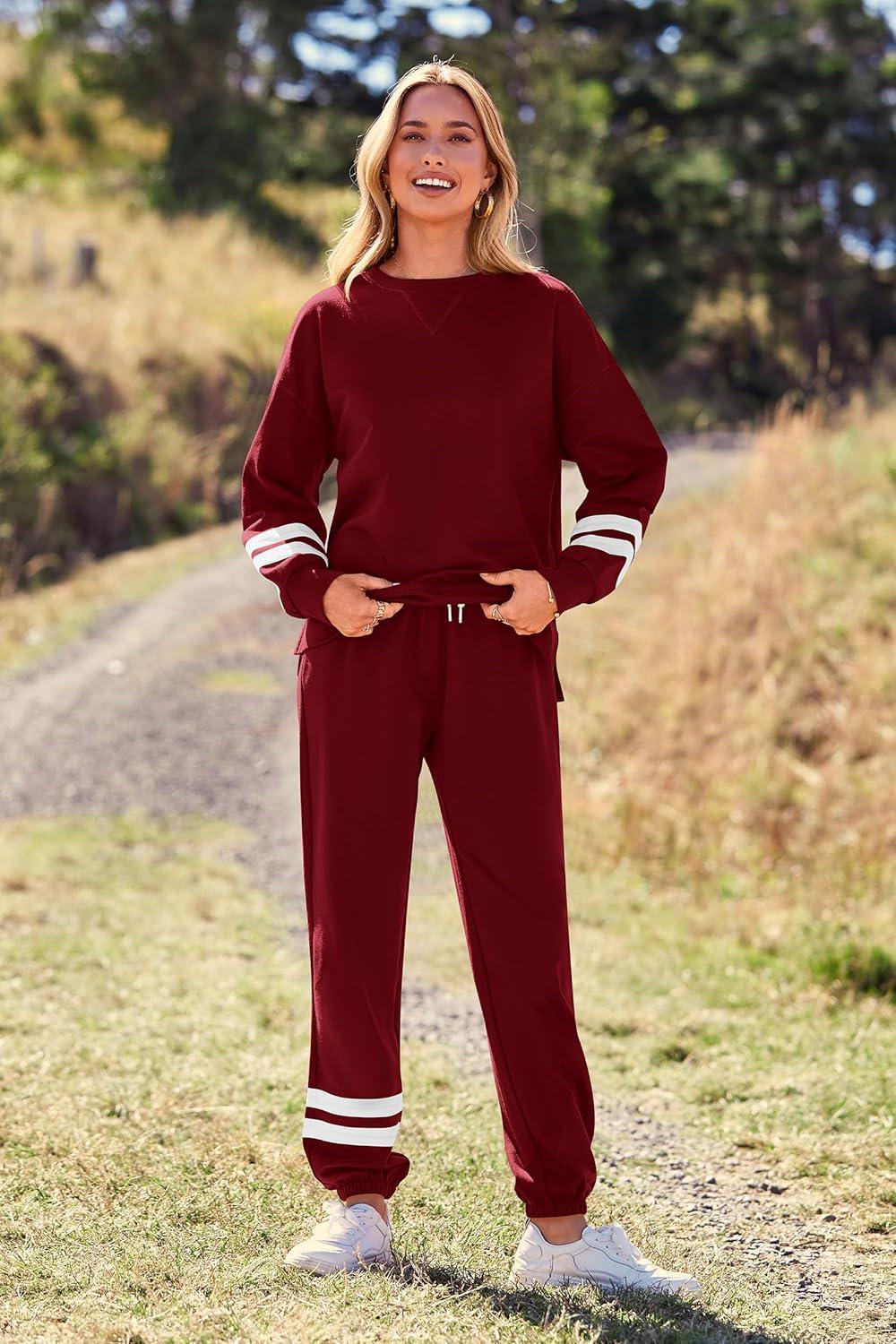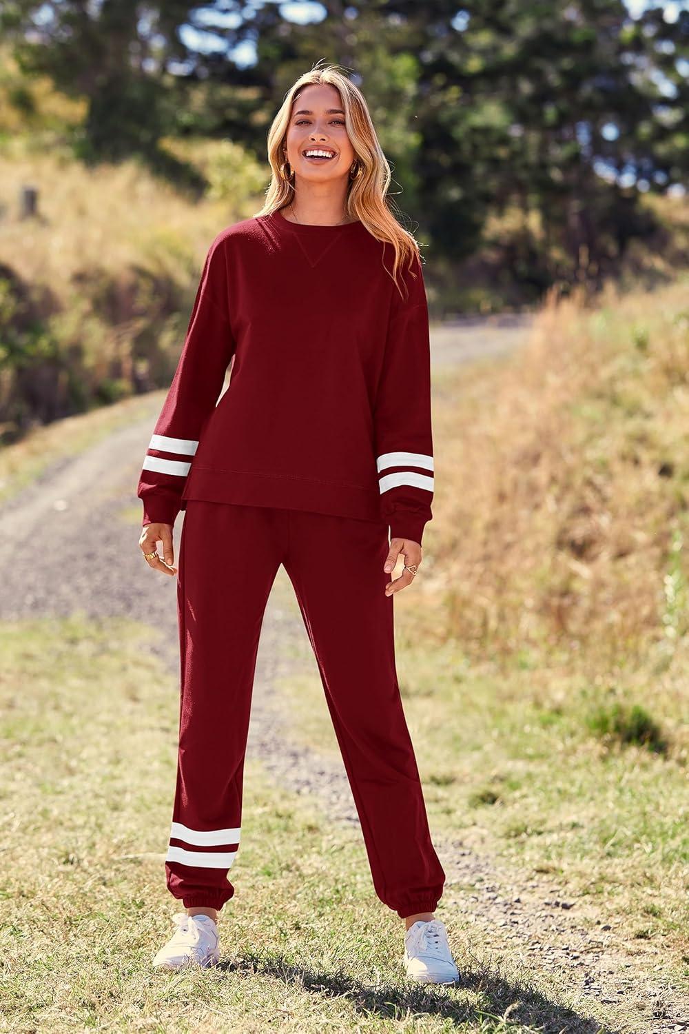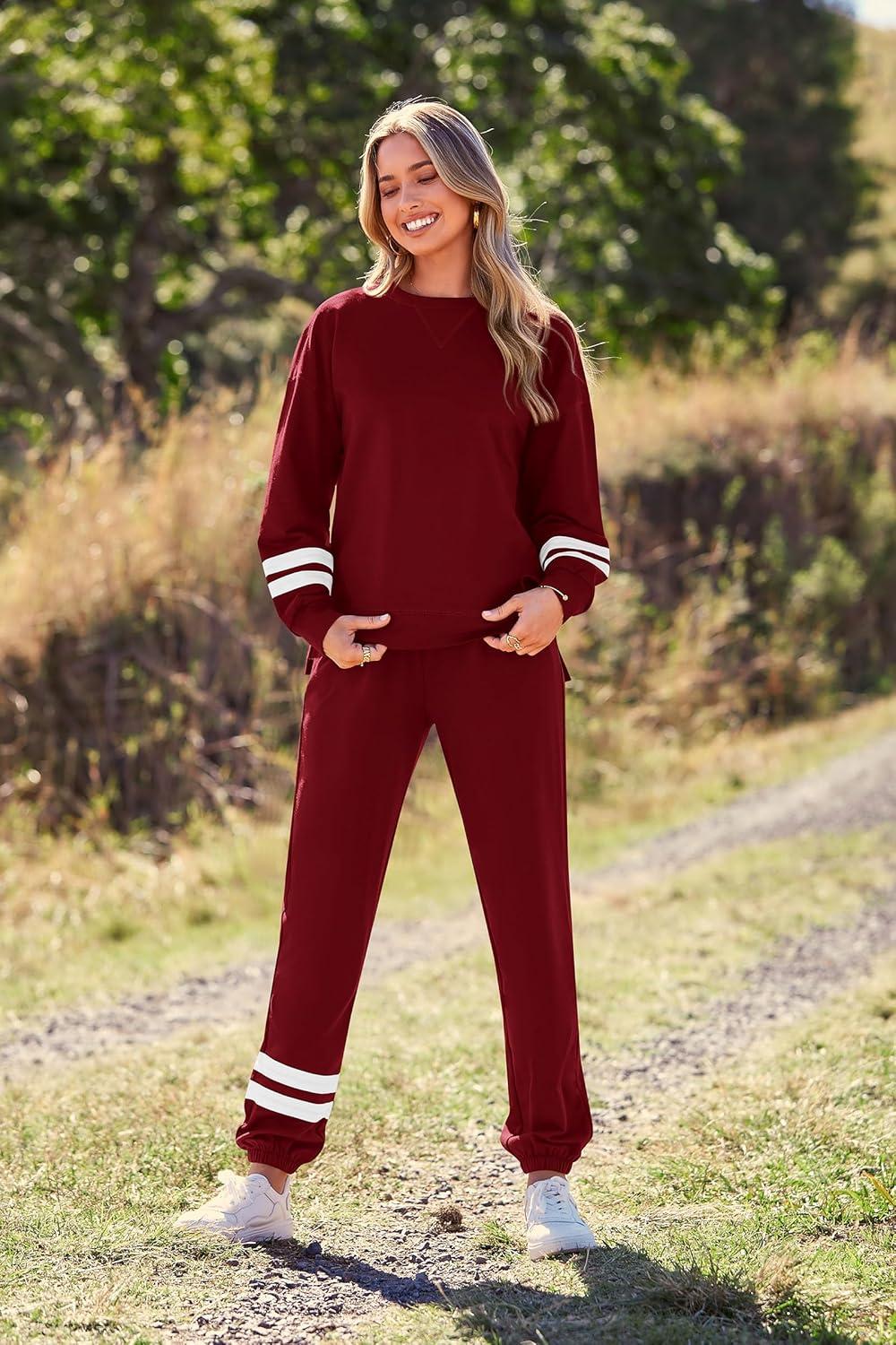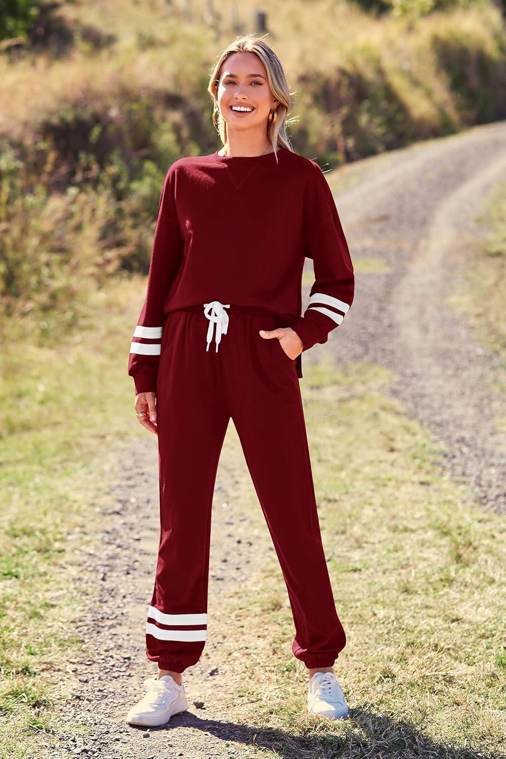 PRETTYGARDEN Women’s Two Piece Loungewear Fall Casual Long Sleeve Tops Jogger Pants Pajama Sets Matching Outfits Clothing(Striped Wine Red)