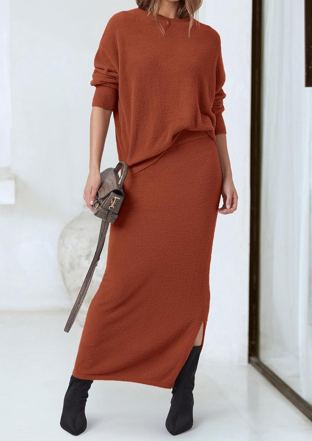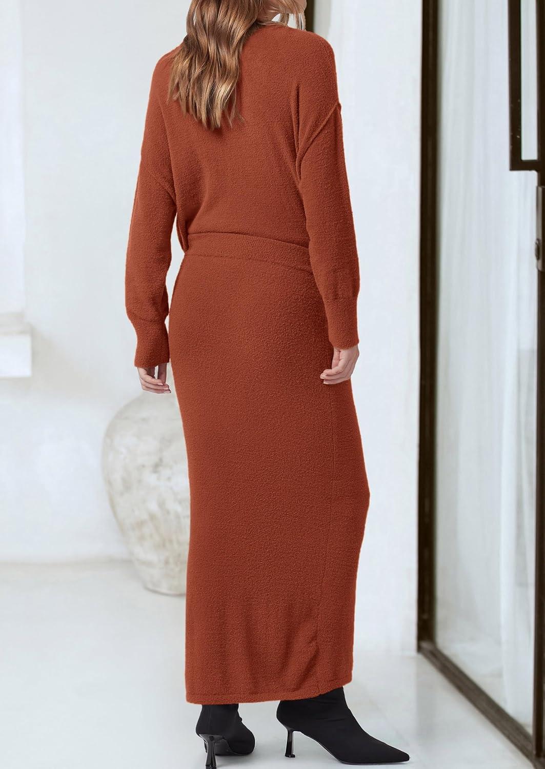 PRETTYGARDEN Women's Two Piece Matching Sweater Sets Knit Long Sleeve Pullover Tops Bodycon Long Maxi Skirts Fall Outfits(Rust Red)