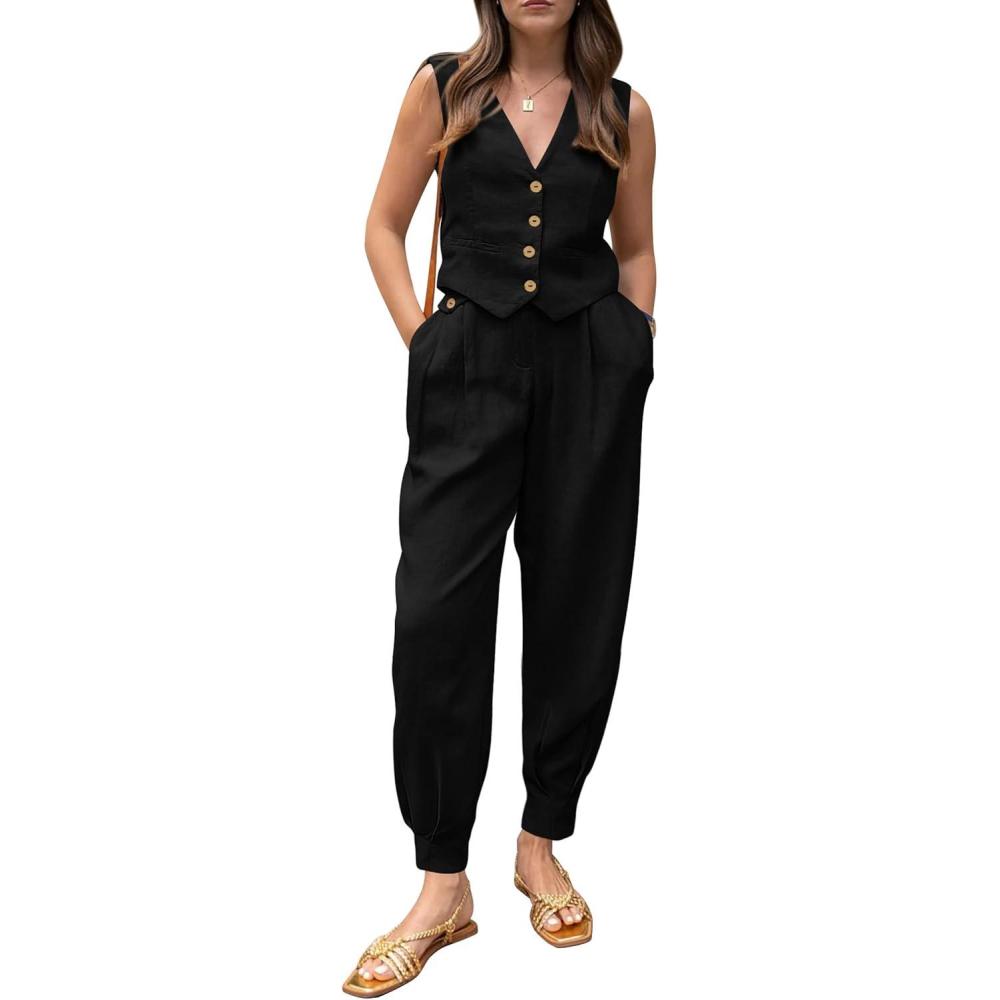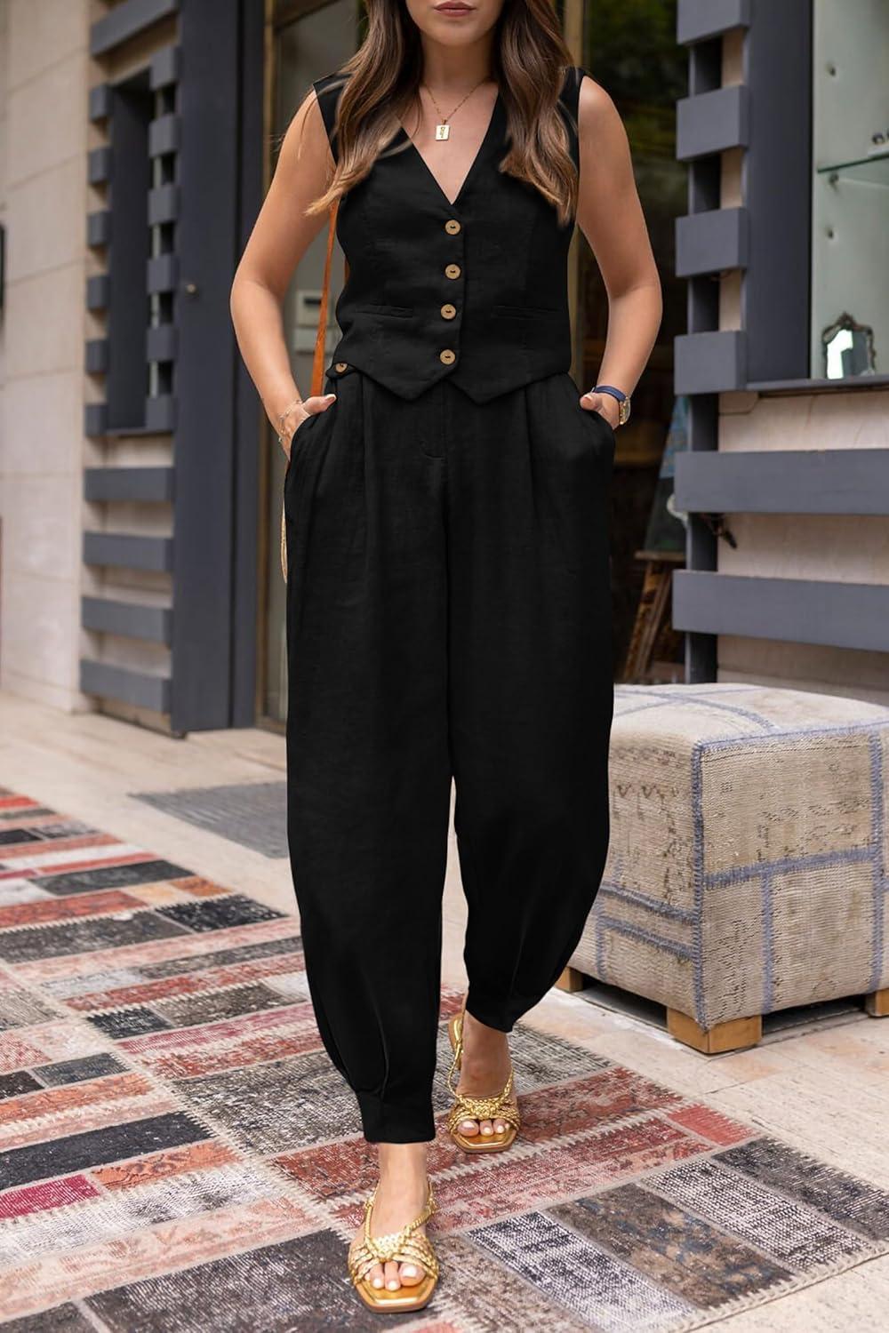 PRETTYGARDEN Women's Two Piece Outfits Summer V Neck Button Front Cropped Tank Tops Vest Pockets Pants Cotton Matching Sets(Black)