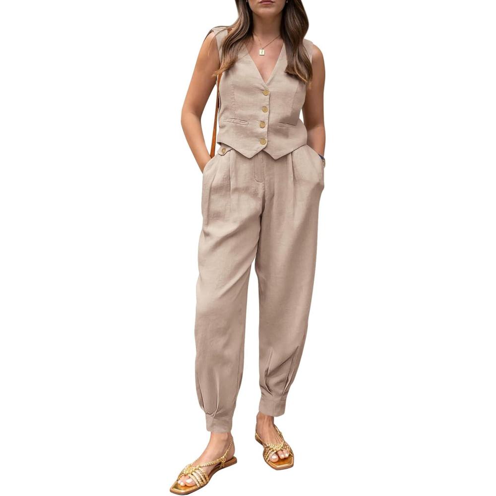 imagePRETTYGARDEN Womens Two Piece Outfits Summer V Neck Button Front Cropped Tank Tops Vest Pockets Pants Cotton Matching SetsLight Khaki