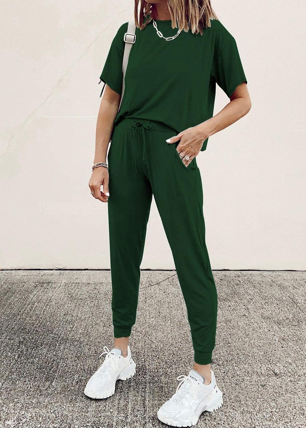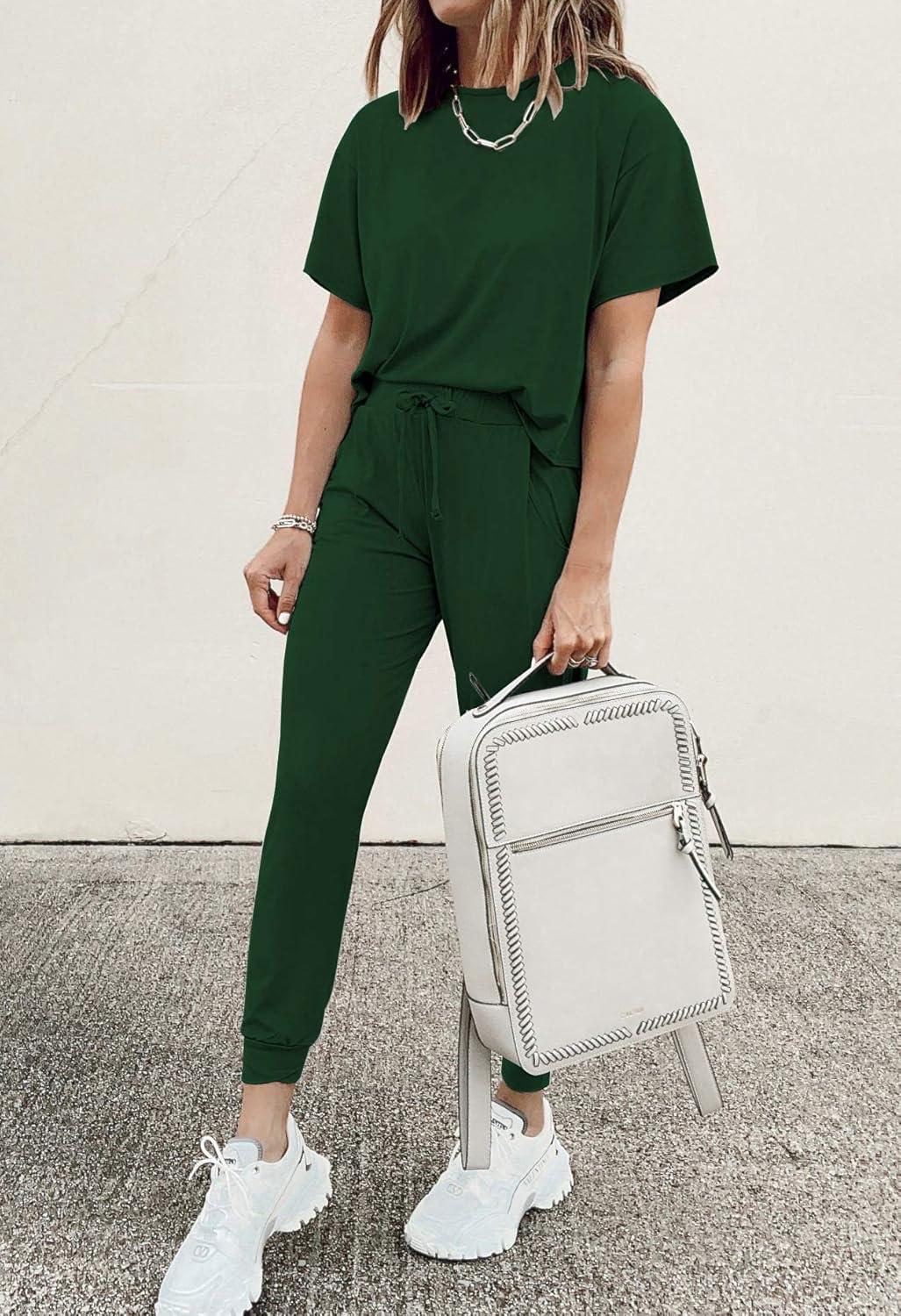 PRETTYGARDEN Women’s Two Piece Sets 2025 Summer Spring Jogger Pants Travel Vacation Lounge Outfits Airplane Matching Clothes(Dark Green)