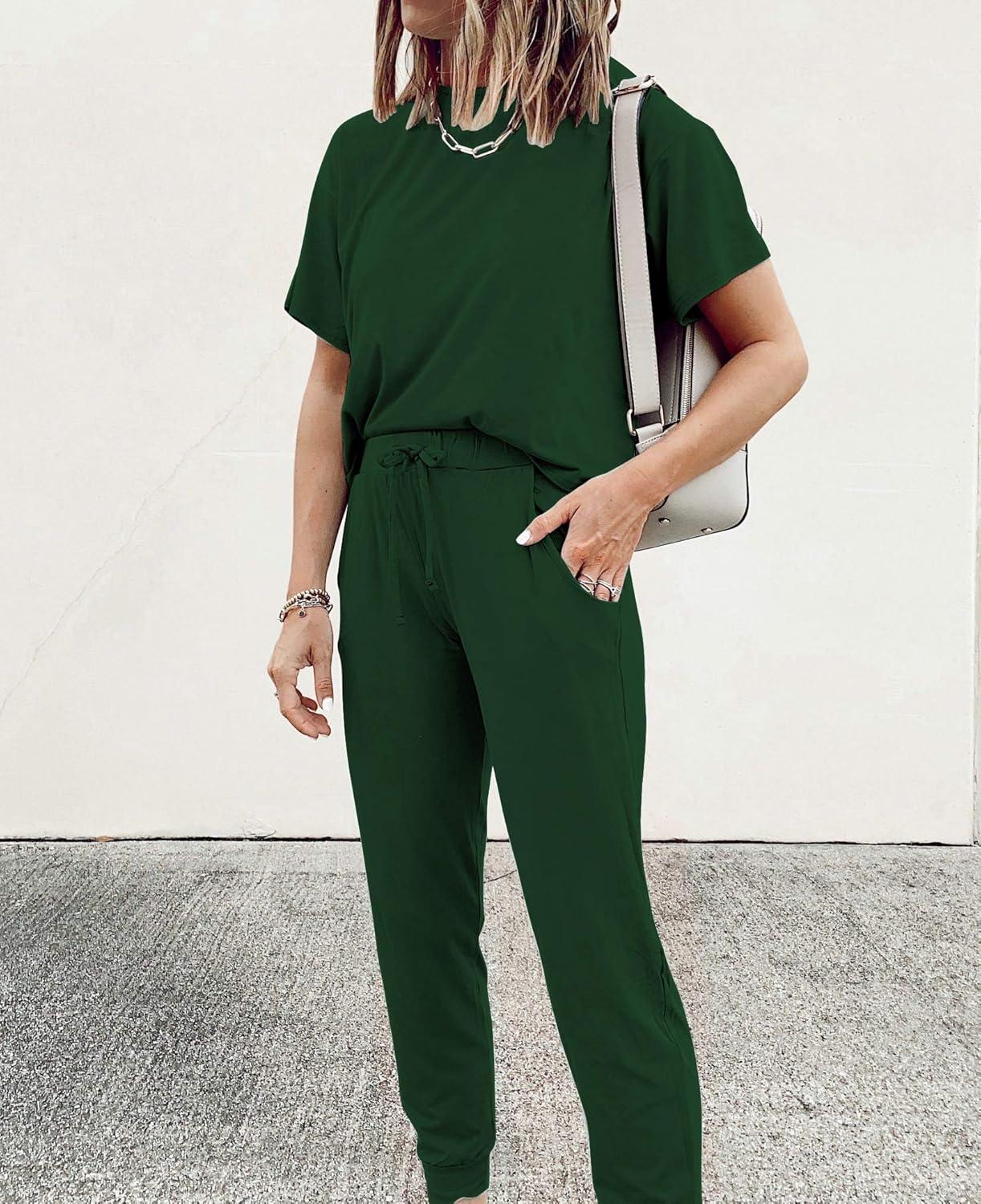 PRETTYGARDEN Women's Two Piece Sets 2025 Summer Spring Jogger Pants Travel Vacation Lounge Outfits Airplane Matching Clothes(Dark Green)