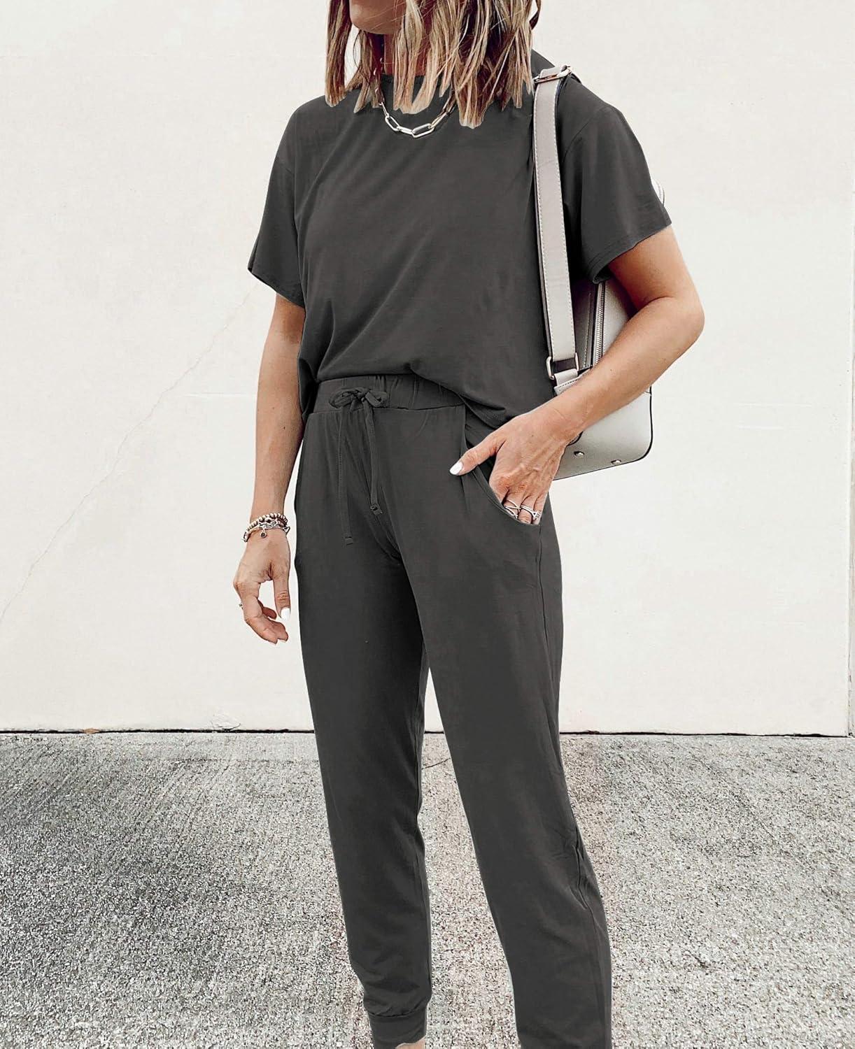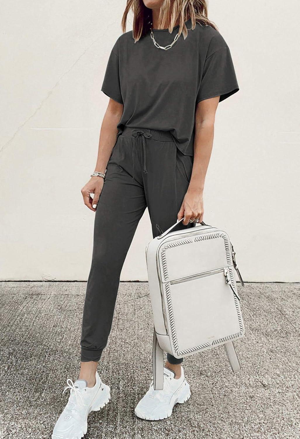 PRETTYGARDEN Women's Two Piece Sets 2025 Summer Spring Jogger Pants Travel Vacation Lounge Outfits Airplane Matching Clothes(Dark Grey)